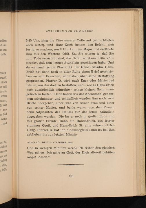 5.45 Uhr, ging die Türe unserer Zelle auf( wir schliefen noch feste!), und Hans- Erich bekam den Befehl, sich fertig zu machen; um 6 Uhr kam ein Major und eröffnete ihm mit den Worten: Oblt. St., Sie wissen ja, daß Sie zum Tode verurteilt sind; das Urteil wird um 8 Uhr vollstreckt, daß sein letztes Stündlein geschlagen habe. Und da war auch schon Pfarrer D., der treue Palladin. HansErich hat dann noch in aller Ruhe einen Brief geschrieben an sein Frauchen, wir haben über seine Bestattung gesprochen, Pfarrer D. wird nach Eger oder Marienbad fahren, um ihn dort zu bestatten, und wie es Hans- Erich noch ausdrücklich wünschte- seinen kleinen Sohn evangelisch zu taufen. Dann haben wir das Abendmahl genommen miteinander, und schließlich wurden ihm noch zwei Briefe übergeben, einer war von seiner Frau und einer von seiner Mutter, und beide waren von den Frauen beim Adjutanten des Hauses für das letzte Stündlein abgegeben worden. Die las er noch in großer Ruhe und mit großer Freude. Dann ein Händedruck, ein letzter stummer Gruß, und Hans- Erich St. ging seinen letzten Gang. Pfarrer D. hat ihn hinausbegleitet und ist bei ihm geblieben bis zur letzten Minute.