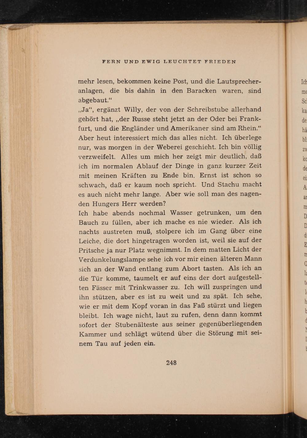 ,, Ja", ergänzt Willy, der von der Schreibstube allerhand gehört hat ,,, der Russe steht jetzt an der Oder bei Frankfurt , und die Engländer und Amerikaner sind am Rhein." Aber heut interessiert mich das alles nicht. Ich überlege nur, was morgen in der Weberei geschieht. Ich bin völlig verzweifelt. Alles um mich her zeigt mir deutlich, daß ich im normalen Ablauf der Dinge in ganz kurzer Zeit mit meinen Kräften zu Ende bin. Ernst ist schon so schwach, daß er kaum noch spricht. Und Stachu macht es auch nicht mehr lange. Aber wie soll man des nagenden Hungers Herr werden?