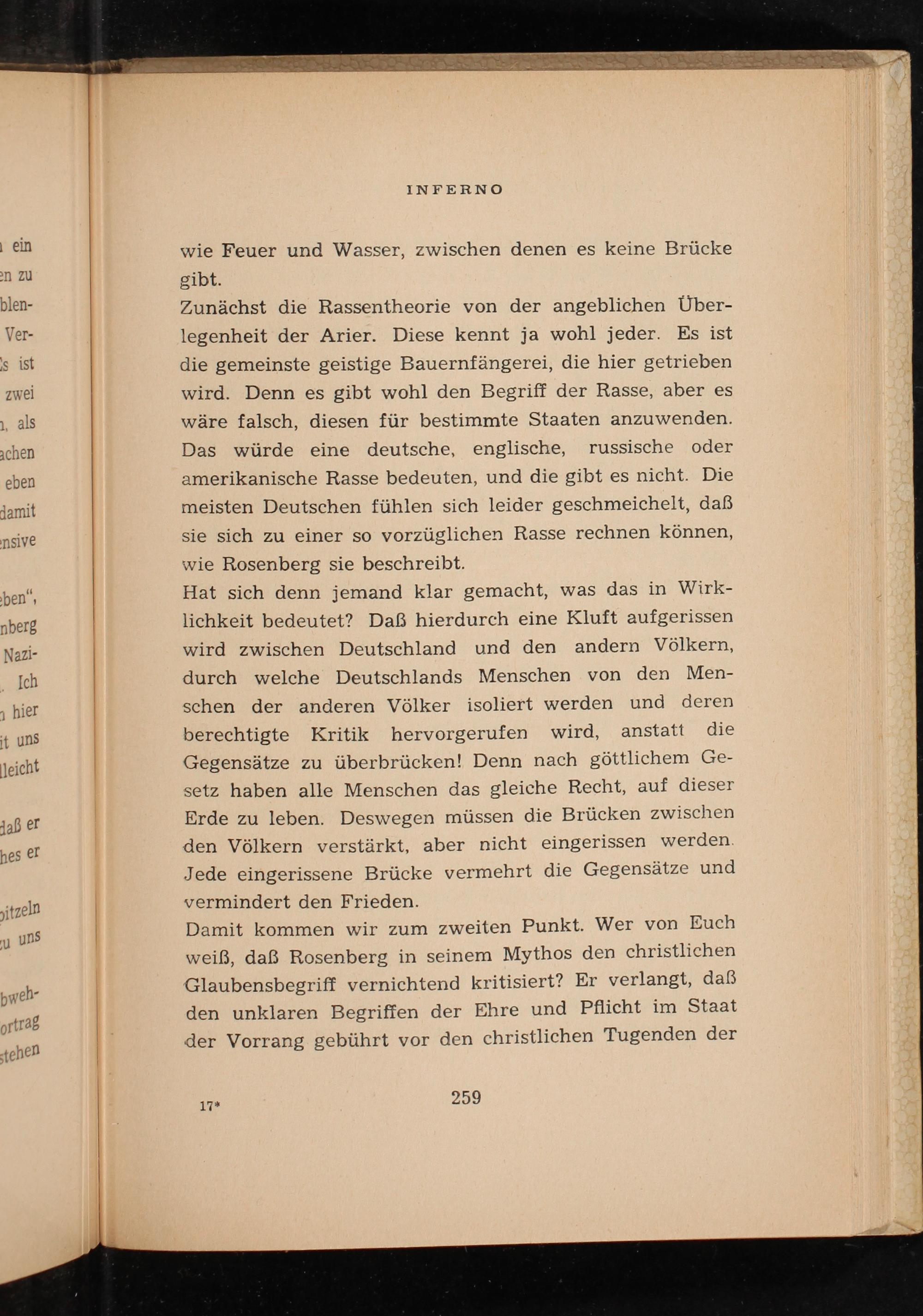 Zunächst die Rassentheorie von der angeblichen Über- legenheit der Arier. Diese kennt ja wohl jeder. Es ist die gemeinste geistige Bauernfängerei, die hier getrieben wird. Denn es gibt wohl den Begriff der Rasse, aber es wäre falsch, diesen für bestimmte Staaten anzuwenden. Das würde eine deutsche, englische, russische oder amerikanische Rasse bedeuten, und die gibt es nicht. Die meisten Deutschen fühlen sich leider geschmeichelt, daß sie sich zu einer so vorzüglichen Rasse rechnen können, wie Rosenberg sie beschreibt.