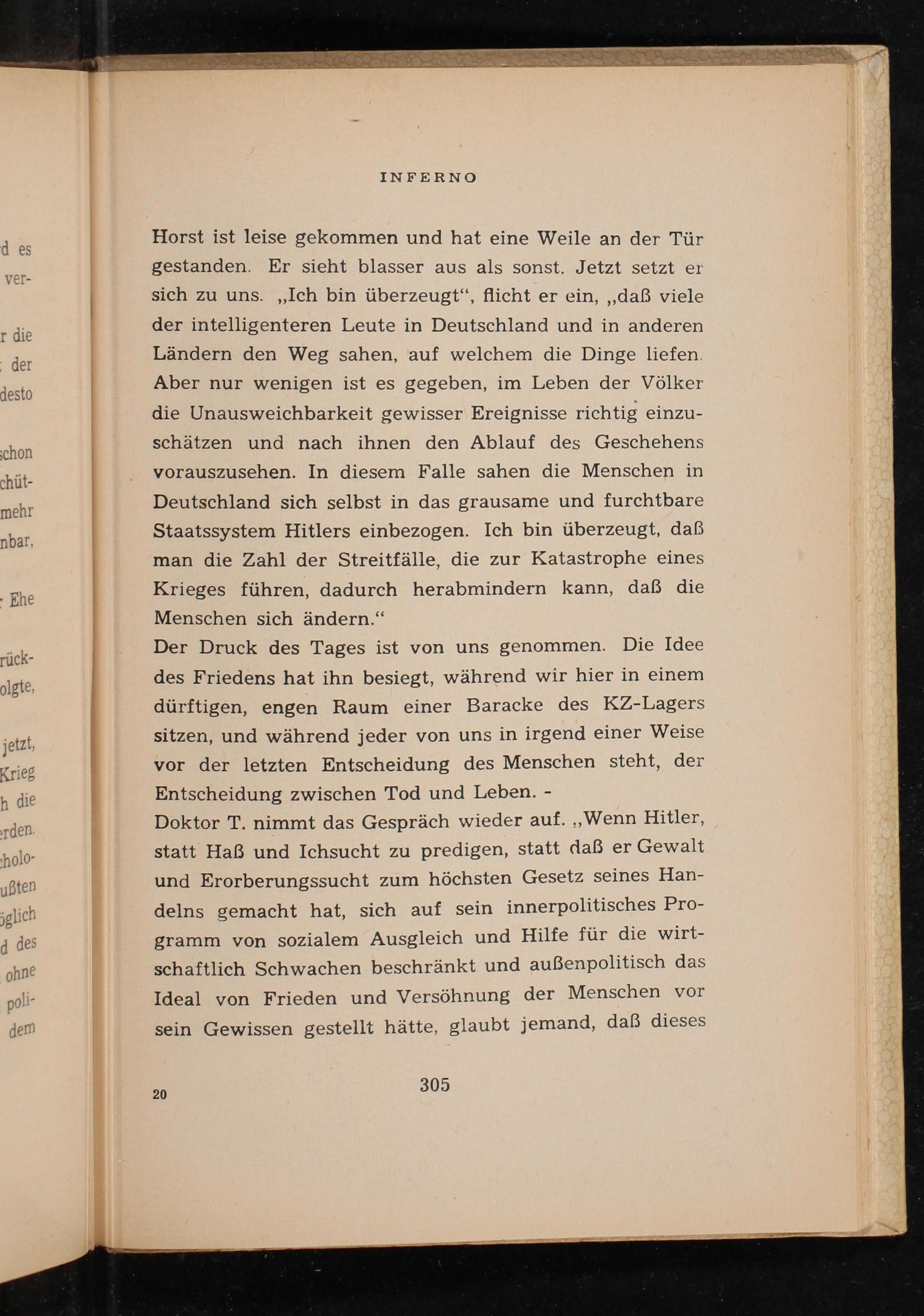 Der Druck des Tages ist von uns genommen. Die Idee des Friedens hat ihn besiegt, während wir hier in einem dürftigen, engen Raum einer Baracke des KZ- Lagers sitzen, und während jeder von uns in irgend einer Weise vor der letzten Entscheidung des Menschen steht, der Entscheidung zwischen Tod und Leben.-