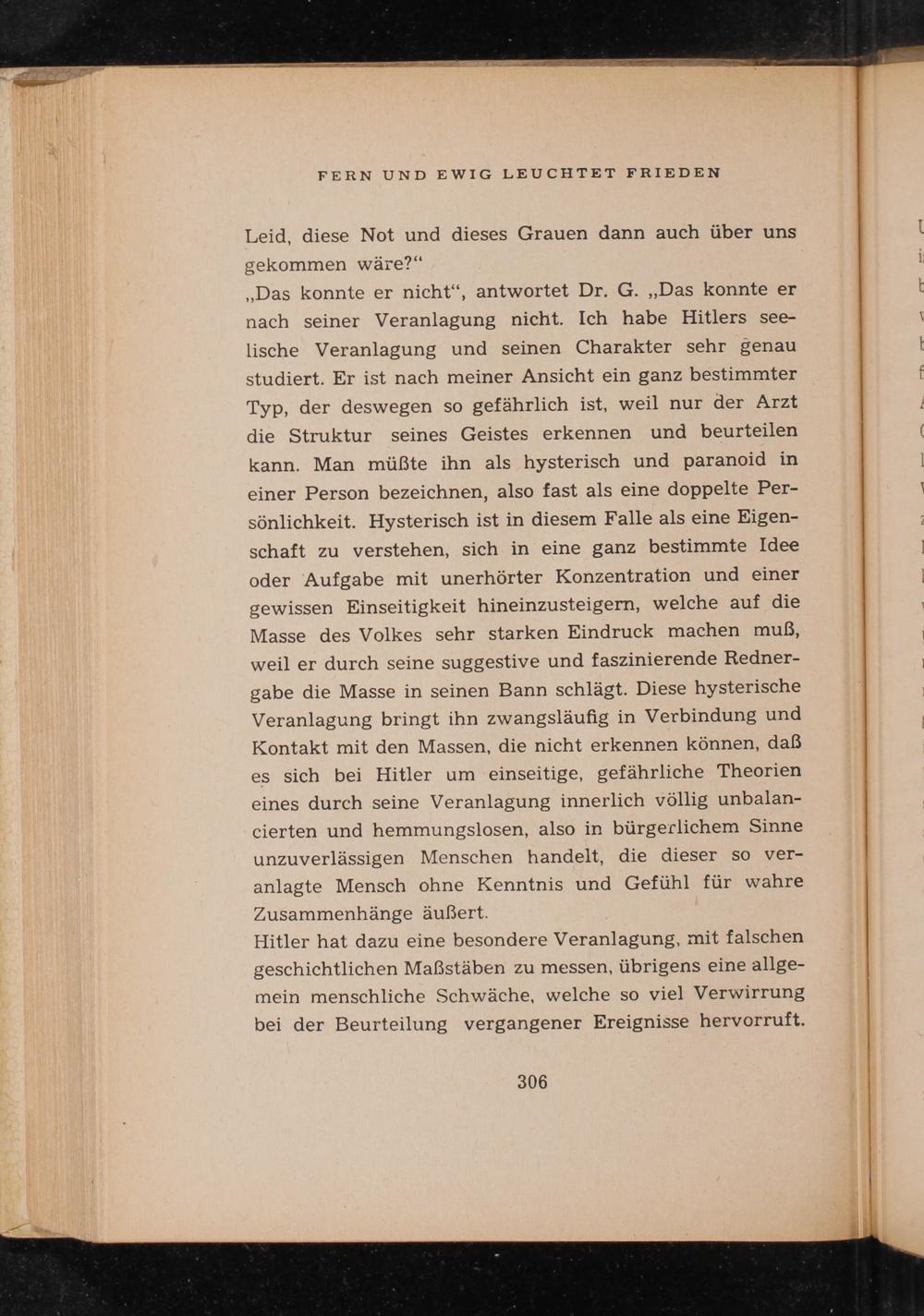 ,, Das konnte er nicht", antwortet Dr. G. ,, Das konnte er nach seiner Veranlagung nicht. Ich habe Hitlers seelische Veranlagung und seinen Charakter sehr genau studiert. Er ist nach meiner Ansicht ein ganz bestimmter Typ, der deswegen so gefährlich ist, weil nur der Arzt die Struktur seines Geistes erkennen und beurteilen kann. Man müßte ihn als hysterisch und paranoid in einer Person bezeichnen, also fast als eine doppelte Persönlichkeit. Hysterisch ist in diesem Falle als eine Eigenschaft zu verstehen, sich in eine ganz bestimmte Idee oder Aufgabe mit unerhörter Konzentration und einer gewissen Einseitigkeit hineinzusteigern, welche auf die Masse des Volkes sehr starken Eindruck machen muß, weil er durch seine suggestive und faszinierende Rednergabe die Masse in seinen Bann schlägt. Diese hysterische Veranlagung bringt ihn zwangsläufig in Verbindung und Kontakt mit den Massen, die nicht erkennen können, daß es sich bei Hitler um einseitige, gefährliche Theorien eines durch seine Veranlagung innerlich völlig unbalancierten und hemmungslosen, also in bürgerlichem Sinne unzuverlässigen Menschen handelt, die dieser so veranlagte Mensch ohne Kenntnis und Gefühl für wahre Zusammenhänge äußert.