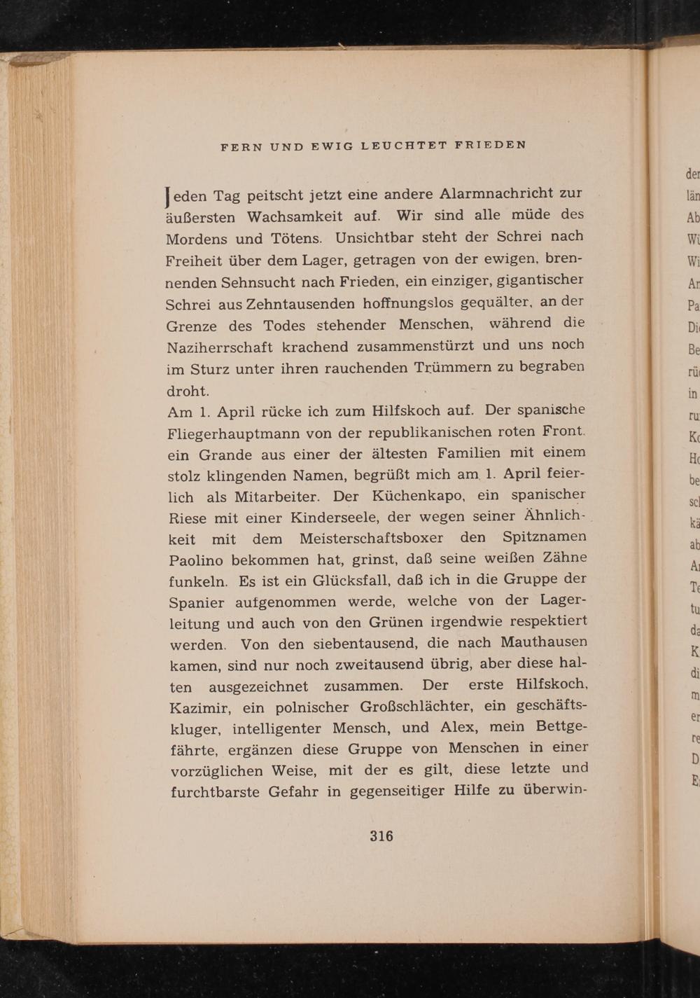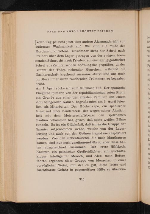 Jeden Tag peitscht jetzt eine andere Alarmnachricht zur äußersten Wachsamkeit auf. Wir sind alle müde des Mordens und Tötens. Unsichtbar steht der Schrei nach Freiheit über dem Lager, getragen von der ewigen, bren- nenden Sehnsucht nach Frieden, ein einziger, gigantischer Schrei aus Zehntausenden hoffnungslos gequälter, an der Grenze des Todes stehender Menschen, während die Naziherrschaft krachend zusammenstürzt und uns noch im Sturz unter ihren rauchenden Trümmern zu begraben droht.