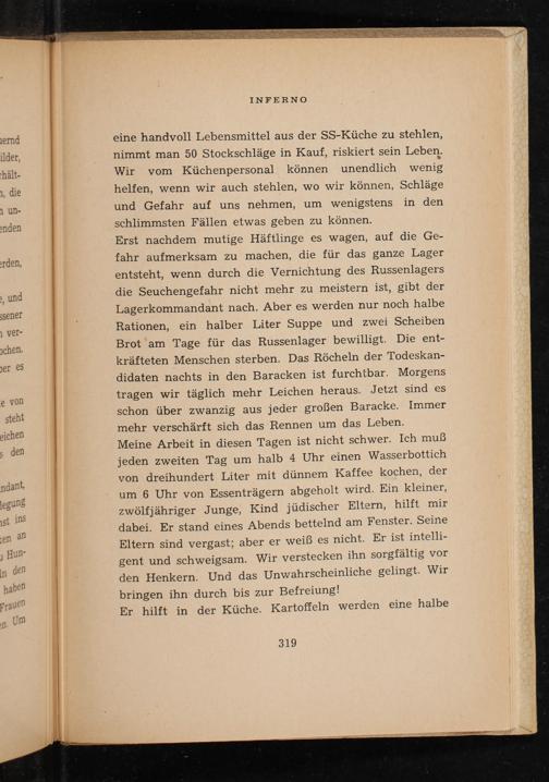 eine handvoll Lebensmittel aus der SS - Küche zu stehlen, nimmt man 50 Stockschläge in Kauf, riskiert sein Leben. Wir vom Küchenpersonal können unendlich wenig helfen, wenn wir auch stehlen, wo wir können, Schläge und Gefahr auf uns nehmen, um wenigstens in den schlimmsten Fällen etwas geben zu können.