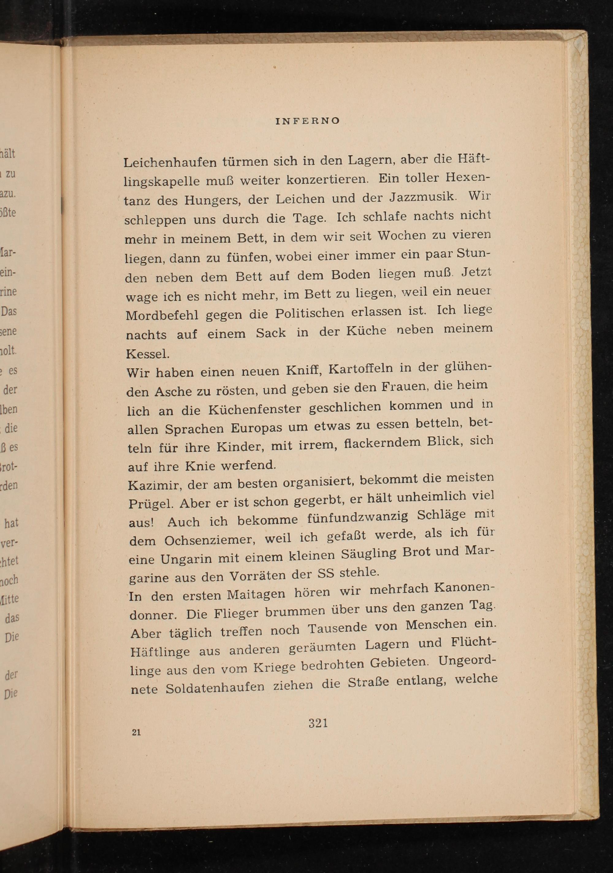 Leichenhaufen türmen sich in den Lagern, aber die Häftlingskapelle muß weiter konzertieren. Ein toller Hexentanz des Hungers, der Leichen und der Jazzmusik. Wir schleppen uns durch die Tage. Ich schlafe nachts nicht mehr in meinem Bett, in dem wir seit Wochen zu vieren liegen, dann zu fünfen, wobei einer immer ein paar Stunden neben dem Bett auf dem Boden liegen muß. Jetzt wage ich es nicht mehr, im Bett zu liegen, weil ein neuer Mordbefehl gegen die Politischen erlassen ist. Ich liege nachts auf einem Sack in der Küche neben meinem Kessel.