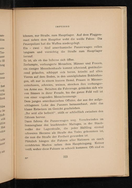Dann fahren die Panzerwagen wes. Verschwinden im Sonnenglanz des leuchtenden Maitages, in der Staub- wolke der Lagerstraße, die jeder Häftling einmal schweren Herzens als Straße des Todes gekommen ist, die nun die Straße der Freiheit geworden ist.
