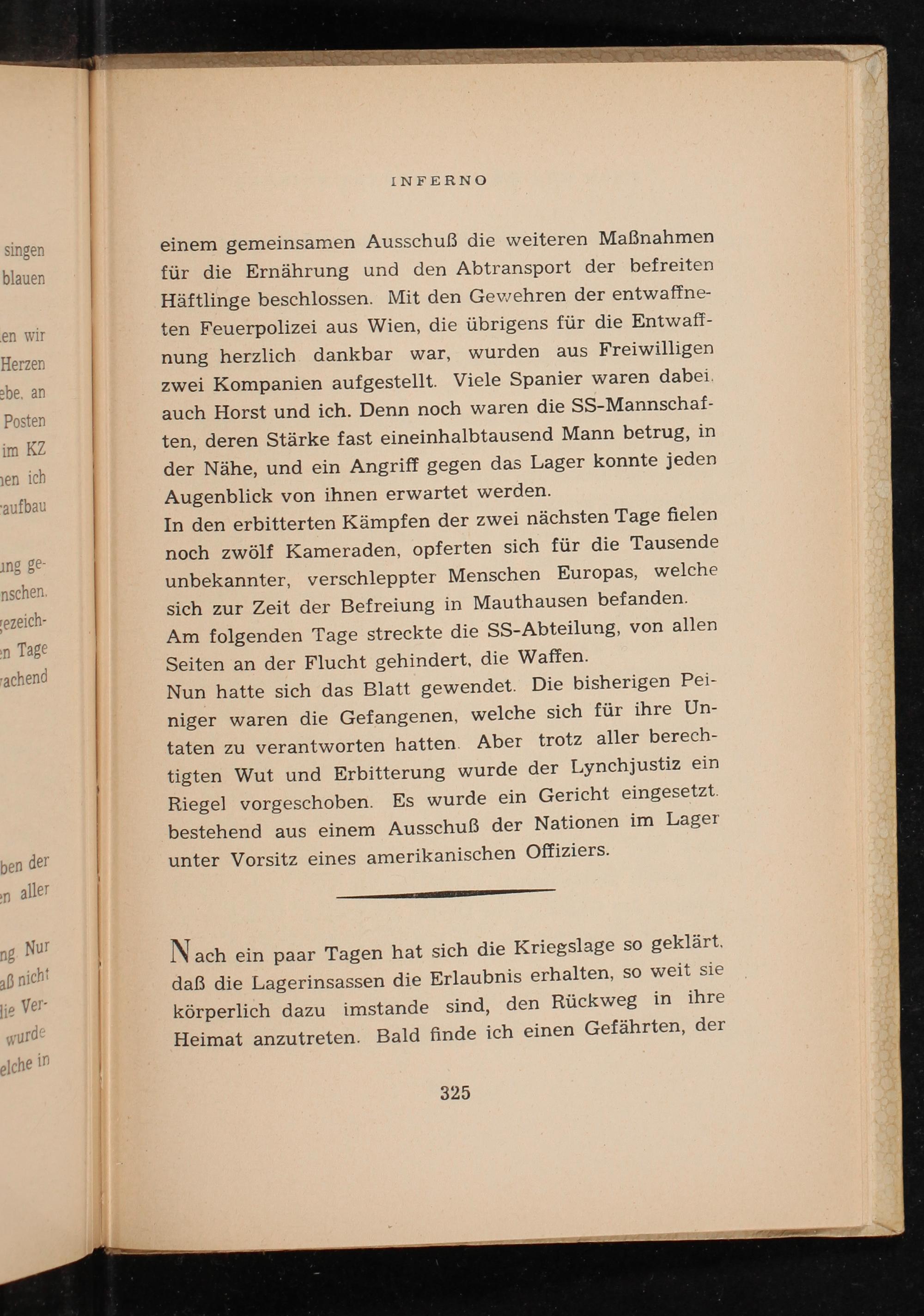 einem gemeinsamen Ausschuß die weiteren Maßnahmen für die Ernährung und den Abtransport der befreiten Häftlinge beschlossen. Mit den Gewehren der entwaffneten Feuerpolizei aus Wien , die übrigens für die Entwaffnung herzlich dankbar war, wurden aus Freiwilligen zwei Kompanien aufgestellt. Viele Spanier waren dabei. auch Horst und ich. Denn noch waren die SS - Mannschaften, deren Stärke fast eineinhalbtausend Mann betrug, in der Nähe, und ein Angriff gegen das Lager konnte jeden Augenblick von ihnen erwartet werden.