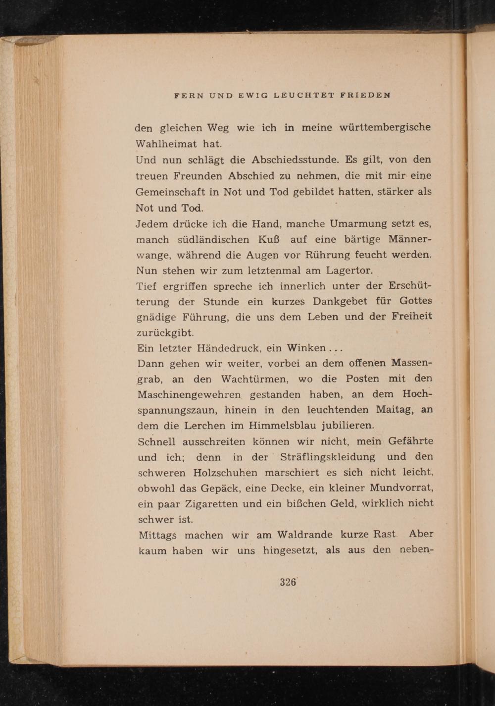 Dann gehen wir weiter, vorbei an dem offenen Massen- grab, an den Wachtürmen, wo die Posten mit den Maschinengewehren gestanden haben, an dem Hoch- spannungszaun, hinein in den leuchtenden Maitag, an dem die Lerchen im Himmelsblau jubilieren.