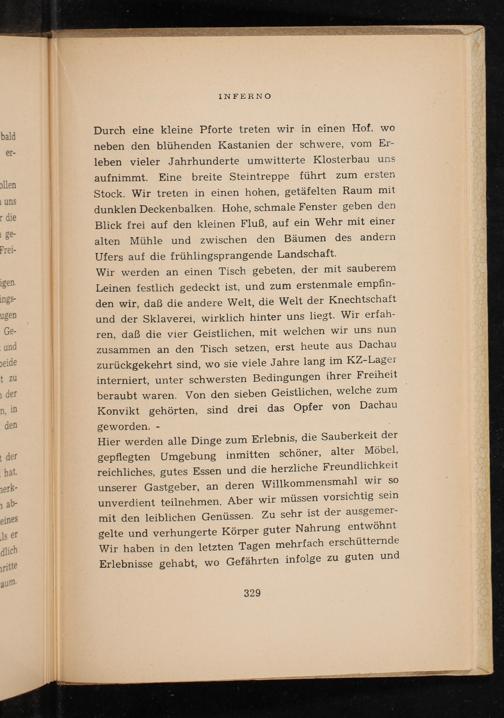 Wir werden an einen Tisch gebeten, der mit sauberem Leinen festlich gedeckt ist, und zum erstenmale empfin- den wir, daß die andere Welt, die Welt der Knechtschaft und der Sklaverei, wirklich hinter uns liegt. Wir erfah- ren, daß die vier Geistlichen, mit welchen wir uns nun zusammen an den Tisch setzen, erst heute aus Dachau zurückgekehrt sind, wo sie viele J ahre lang im KZ-Lageır interniert, unter schwersten Bedingungen ihrer Freiheit beraubt waren. Von den sieben Geistlichen, welche zum Konvikt gehörten, sind drei das Opfer von Dachau geworden.- L Hier werden alle Dinge zum Erlebnis, die Sauberkeit der gepflegten Umgebung inmitten schöner, alter Möbel, reichliches, gutes Essen und die herzliche Freundlichkeit unserer Gastgeber, an deren Willkommensmahl wir so