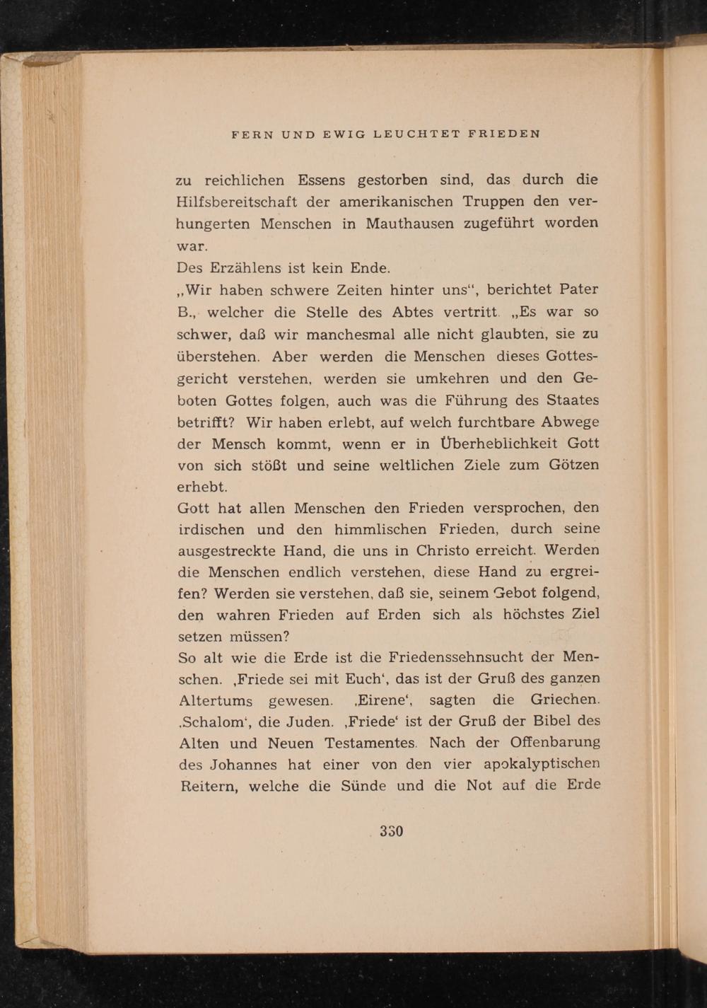 So alt wie die Erde ist die Friedenssehnsucht der Menschen. Friede sei mit Euch', das ist der Gruß des ganzen Altertums gewesen..Eirene', sagten die Griechen. .Schalom', die Juden. , Friede' ist der Gruß der Bibel des Alten und Neuen Testamentes. Nach der Offenbarung des Johannes hat einer von den vier apokalyptischen Reitern, welche die Sünde und die Not auf die Erde