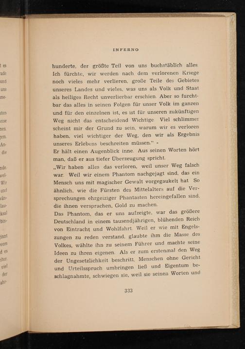 Das Phantom, das er uns aulzeigte, war das größere Deutschland in einem tausendjährigen, blühenden Reich von Eintracht und Wohlfahrt. Weil er wie mit Engels- zungen zu reden verstand, glaubte ihm die Masse des Volkes, wählte ihn zu seinem Führer und machte seine Ideen zu ihren eigenen. Als er zum erstenmal den Weg der Ungesetzlichkeit beschritt, Menschen ohne Gericht und Urteilsspruch umbringen ließ und Eigentum be- schlagnahmte, schwiegen sie, weil sie seinen Worten und 333