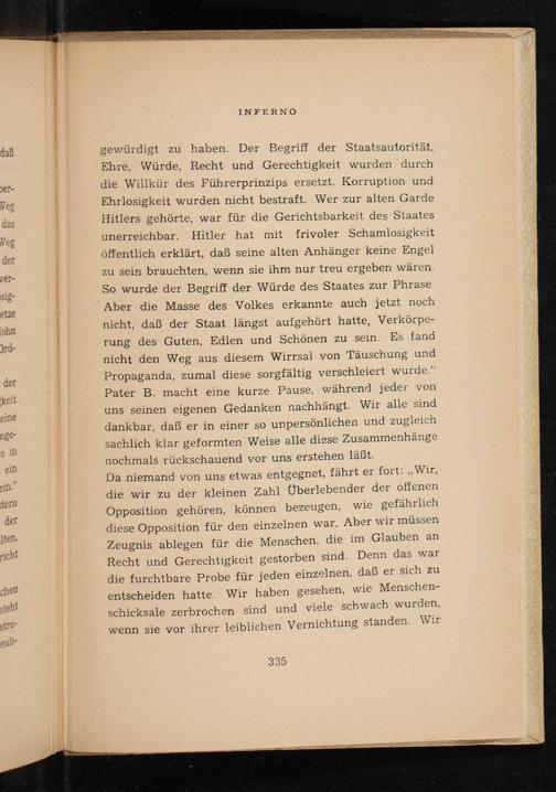 gewürdigt zu haben. Der Begriff der Staatsautorität, Ehre, Würde, Recht und Gerechtigkeit wurden durch die Willkür des Führerprinzips ersetzt. Korruption und Ehrlosigkeit wurden nicht bestraft. Wer zur alten Garde Hitlers gehörte, war für die Gerichtsbarkeit des Staates unerreichbar. Hitler hat mit frivoler Schamlosigkeit öffentlich erklärt, daß seine alten Anhänger keine Engel zu sein brauchten, wenn sie ihm nur treu ergeben wären. So wurde der Begriff der Würde des Staates zur Phrase. Aber die Masse des Volkes erkannte auch jetzt noch nicht, daß der Staat längst aufgehört hatte, Verkörperung des Guten, Edlen und Schönen zu sein. Es fand nicht den Weg aus diesem Wirrsal von Täuschung und Propaganda, zumal diese sorgfältig verschleiert wurde." Pater B. macht eine kurze Pause, während jeder von uns seinen eigenen Gedanken nachhängt. Wir alle sind dankbar, daß er in einer so unpersönlichen und zugleich sachlich klar geformten Weise alle diese Zusammenhänge nochmals rückschauend vor uns erstehen läßt.