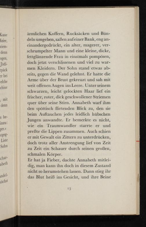 ärmlichen Koffern, Rucksäcken und Bündeln umgeben, saßen auf einer Bank, eng aneinandergedrückt, ein alter, magerer, verschrumpelter Mann und eine kleine, dicke, fettglänzende Frau in einstmals pompösen, doch jetzt verschlissenen und viel zu warmen Kleidern. Der Sohn stand etwas abseits, gegen die Wand gelehnt. Er hatte die Arme über der Brust gekreuzt und sah mit weit offenen Augen ins Leere. Unter seinem schwarzen, leicht gelockten Haar lief ein frischer, roter, dick geschwollener Striemen quer über seine Stirn. Annabeth warf ihm den spöttisch flirtenden Blick zu, den sie beim Auftauchen jedes leidlich hübschen Jungen anwandte. Er bemerkte es nicht, wie ein Traumwandler starrte er und preẞte die Lippen zusammen. Auch schien er mit Gewalt ein Zittern zu unterdrücken, doch trotz aller Anstrengung lief von Zeit zu Zeit ein Schauer durch seinen großen, schmalen Körper.