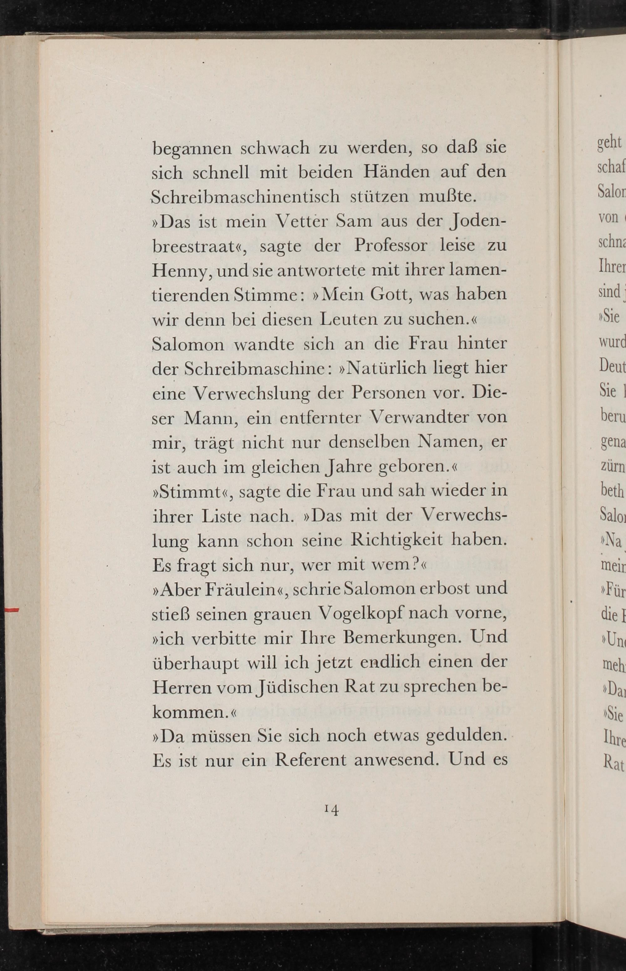 begannen schwach zu werden, so daß sie sich schnell mit beiden Händen auf den Schreibmaschinentisch stützen mußte. » Das ist mein Vetter Sam aus der Jodenbreestraat«, sagte der Professor leise zu Henny, und sie antwortete mit ihrer lamentierenden Stimme:» Mein Gott, was haben wir denn bei diesen Leuten zu suchen.<< Salomon wandte sich an die Frau hinter der Schreibmaschine:» Natürlich liegt hier eine Verwechslung der Personen vor. Dieser Mann, ein entfernter Verwandter von mir, trägt nicht nur denselben Namen, er ist auch im gleichen Jahre geboren.<< >> Stimmt«, sagte die Frau und sah wieder in ihrer Liste nach.» Das mit der Verwechslung kann schon seine Richtigkeit haben. Es fragt sich nur, wer mit wem?<<