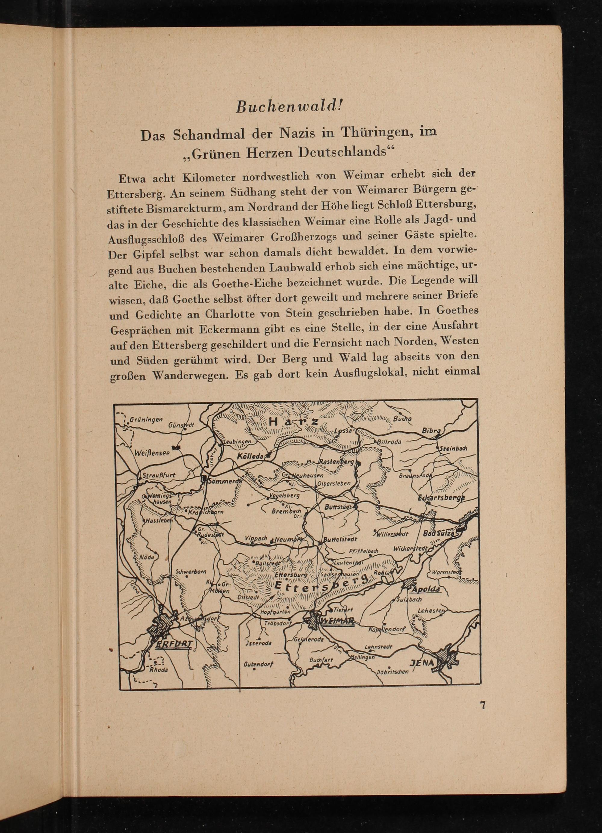 Etwa acht Kilometer nordwestlich von Weimar erhebt sich der Ettersberg. An seinem Südhang steht der von Weimarer Bürgern gestiftete Bismarckturm, am Nordrand der Höhe liegt Schloß Ettersburg , das in der Geschichte des klassischen Weimar eine Rolle als Jagd- und Ausflugsschloß des Weimarer Großherzogs und seiner Gäste spielte. Der Gipfel selbst war schon damals dicht bewaldet. In dem vorwiegend aus Buchen bestehenden Laubwald erhob sich eine mächtige, uralte Eiche, die als Goethe- Eiche bezeichnet wurde. Die Legende will wissen, daß Goethe selbst öfter dort geweilt und mehrere seiner Briefe und Gedichte an Charlotte von Stein geschrieben habe. In Goethes Gesprächen mit Eckermann gibt es eine Stelle, in der eine Ausfahrt auf den Ettersberg geschildert und die Fernsicht nach Norden, Westen und Süden gerühmt wird. Der Berg und Wald lag abseits von den großen Wanderwegen. Es gab dort kein Ausflugslokal, nicht einmal