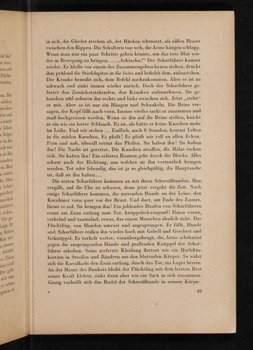 Die ersten Scharführer kommen an mit ihren Schweißhunden. Man vergißt, auf die Uhr zu schauen, denn jetzt vergeht die Zeit. Noch einige Scharführer kommen, die zerrenden Hunde an der Leine, den Karabiner vorn quer vor der Brust. Und dort, am Ende des Zaunes, lärmt es auf. Sie bringen ihn! Ein johlender Haufen von Scharführern rennt am Zaun entlang zum Tor, knüppelschwingend! Ihnen voran, torkelnd und taumelnd, etwas, das einem Menschen ähnlich sieht. Der Flüchtling, von Hunden umrast und angesprungen. Er fällt, Hunde und Scharführer reißen ihn wieder hoch mit Gebell und Geschrei und Geknüppel. Er torkelt weiter, vornübergebeugt, die, Arme schützend gegen die anspringenden Hunde und prellenden Knüppel der Scharführer erhoben. Seine zerfetzte Kleidung flattert wie ein Harlekin-. kostüm in Streifen und Bändern um den blutenden Körper. So wälzt sich die Kavalkade den Zaun entlang, durch das Tor, ins Lager herein. An der Mauer des Bunkers bleibt der Flüchtling mit dem letzten Rest seiner Kraft kleben, sinkt dann aber wie ein Sack in sich zusammen. Gierig verbeißt sich das Rudel der Schweißhunde in seinem Körper.