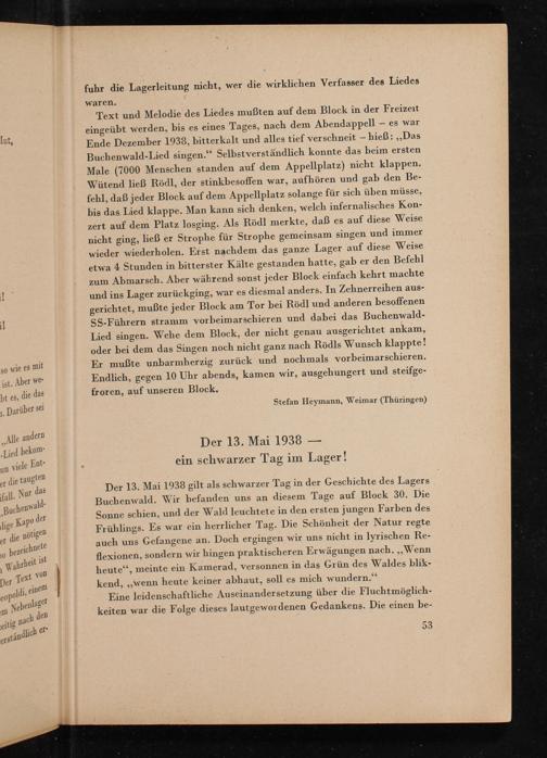 Der 13. Mai 1938 gilt als schwarzer Tag in der Geschichte des Lagers Buchenwald. Wir befanden uns an diesem Tage auf Block 30. Die Sonne schien, und der Wald leuchtete in den ersten jungen Farben des Frühlings. Es war ein herrlicher Tag. Die Schönheit der Natur regte auch uns Gefangene an. Doch ergingen wir uns nicht in lyrischen Reflexionen, sondern wir hingen praktischeren Erwägungen nach. ,, Wenn heute", meinte ein Kamerad, versonnen in das Grün des Waldes blikkend ,,, wenn heute keiner abhaut, soll es mich wundern."