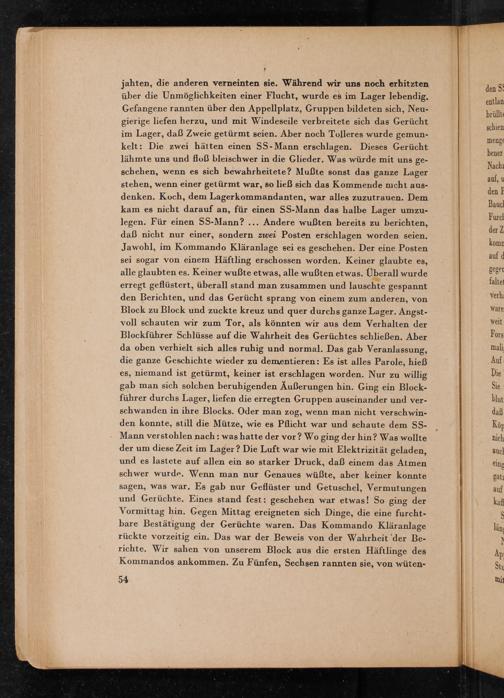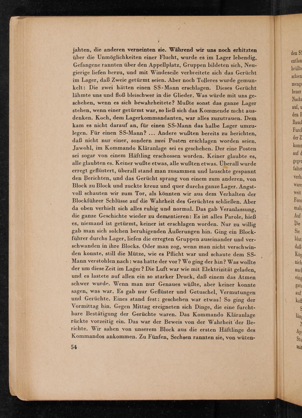 jahten, die anderen verneinten sie. Während wir uns noch erhitzten über die Unmöglichkeiten einer Flucht, wurde es im Lager lebendig. Gefangene rannten über den Appellplatz, Gruppen bildeten sich, Neugierige liefen herzu, und mit Windeseile verbreitete sich das Gerücht im Lager, daß Zweie getürmt seien. Aber noch Tolleres wurde kelt: Die zwei hätten einen SS- Mann erschlagen. Dieses Gerücht lähmte uns und floß bleischwer in die Glieder. Was würde mit uns geschehen, wenn es sich bewahrheitete? Mußte sonst das ganze Lager stehen, wenn einer getürmt war, so ließ sich das Kommende nicht ausdenken. Koch, dem Lagerkommandanten, war alles zuzutrauen. Dem kam es nicht darauf an, für einen SS- Mann das halbe Lager umzulegen. Für einen SS- Mann?... Andere wußten bereits zu berichten, daß nicht nur einer, sondern zwei Posten erschlagen worden seien. Jawohl, im Kommando Kläranlage sei es geschehen. Der eine Posten sei sogar von einem Häftling erschossen worden. Keiner glaubte es, alle glaubten es. Keiner wußte etwas, alle wußten etwas. Überall wurde erregt geflüstert, überall stand man zusammen und lauschte gespannt den Berichten, und das Gerücht sprang von einem zum anderen, von Block zu Block und zuckte kreuz und quer durchs ganze Lager. Angstvoll schauten wir zum Tor, als könnten wir aus dem Verhalten der Blockführer Schlüsse auf die Wahrheit des Gerüchtes schließen. Aber da oben verhielt sich alles ruhig und normal. Das gab Veranlassung, die ganze Geschichte wieder zu dementieren: Es ist alles Parole, hieß es, niemand ist getürmt, keiner ist erschlagen worden. Nur zu willig gab man sich solchen beruhigenden Äußerungen hin. Ging ein Blockführer durchs Lager, liefen die erregten Gruppen auseinander und verschwanden in ihre Blocks. Oder man zog, wenn man nicht verschwinden konnte, still die Mütze, wie es Pflicht war und schaute dem SSMann verstohlen nach: was hatte der vor? Wo ging der hin? Was wollte der um diese Zeit im Lager? Die Luft war wie mit Elektrizität geladen, und es lastete auf allen ein so starker Druck, daß einem das Atmen schwer wurde. Wenn man nur Genaues wüßte, aber keiner konnte sagen, was war. Es gab nur Geflüster und Getuschel, Vermutungen und Gerüchte. Eines stand fest: geschehen war etwas! So ging der Vormittag hin. Gegen Mittag ereigneten sich Dinge, die eine furchtbare Bestätigung der Gerüchte waren. Das Kommando Kläranlage rückte vorzeitig ein. Das war der Beweis von der Wahrheit der Berichte. Wir sahen von unserem Block aus die ersten Häftlinge des Kommandos ankommen. Zu Fünfen, Sechsen rannten sie, von wüten