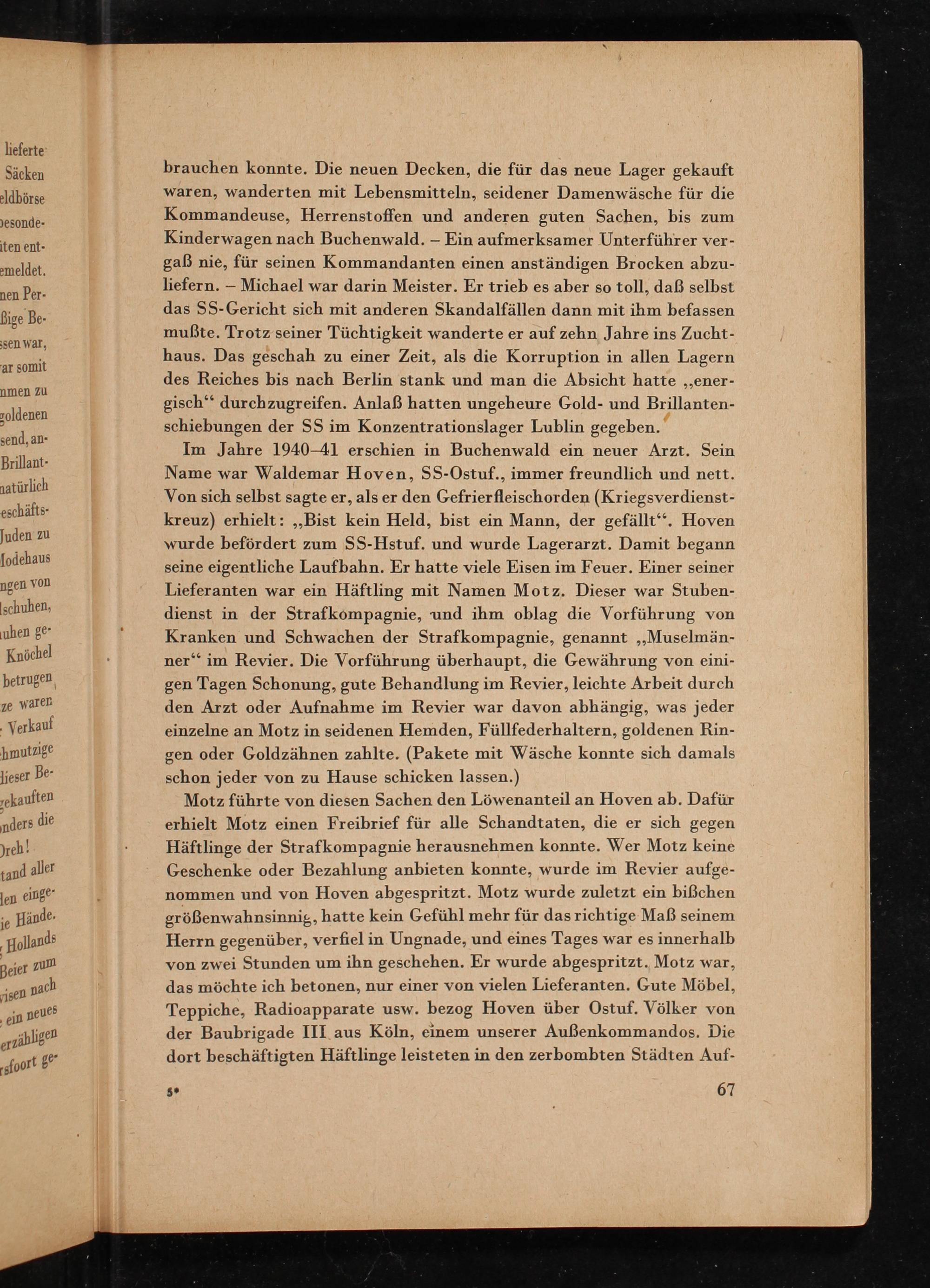 Im Jahre 1940-41 erschien in Buchenwald ein neuer Arzt. Sein Name war Waldemar Hoven , SS- Ostuf., immer freundlich und nett. Von sich selbst sagte er, als er den Gefrierfleischorden( Kriegsverdienstkreuz) erhielt: ,, Bist kein Held, bist ein Mann, der gefällt". Hoven wurde befördert zum SS- Hstuf. und wurde Lagerarzt. Damit begann seine eigentliche Laufbahn. Er hatte viele Eisen im Feuer. Einer seiner Lieferanten war ein Häftling mit Namen Motz. Dieser war Stubendienst in der Strafkompagnie, und ihm oblag die Vorführung von Kranken und Schwachen der Strafkompagnie, genannt ,, Muselmänner" im Revier. Die Vorführung überhaupt, die Gewährung von einigen Tagen Schonung, gute Behandlung im Revier, leichte Arbeit durch den Arzt oder Aufnahme im Revier war davon abhängig, was jeder einzelne an Motz in seidenen Hemden, Füllfederhaltern, goldenen Rinoder Goldzähnen zahlte.( Pakete mit Wäsche konnte sich damals schon jeder von zu Hause schicken lassen.)