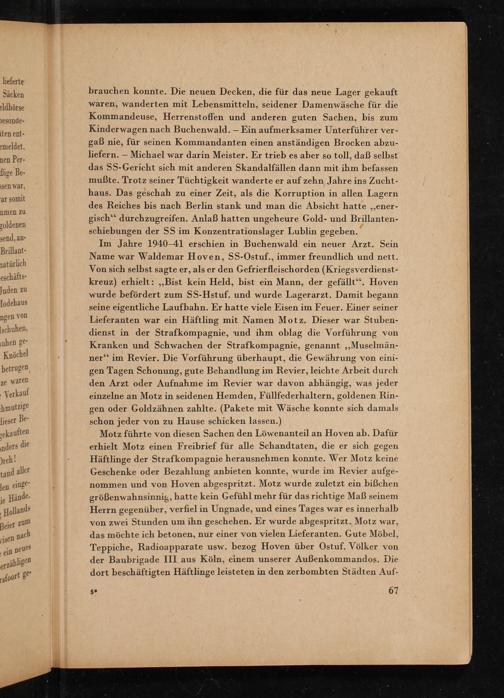Motz führte von diesen Sachen den Löwenanteil an Hoven ab. Dafür erhielt Motz einen Freibrief für alle Schandtaten, die er sich gegen Häftlinge der Strafkompagnie herausnehmen konnte. Wer Motz keine Geschenke oder Bezahlung anbieten konnte, wurde im Revier aufgenommen und von Hoven abgespritzt. Motz wurde zuletzt ein bißchen größenwahnsinnig, hatte kein Gefühl mehr für das richtige Maß seinem Herrn gegenüber, verfiel in Ungnade, und eines Tages war es innerhalb von zwei Stunden um ihn geschehen. Er wurde abgespritzt. Motz war, das möchte ich betonen, nur einer von vielen Lieferanten. Gute Möbel, Teppiche, Radioapparate usw. bezog Hoven über Ostuf. Völker von der Baubrigade III aus Köln , einem unserer Außenkommandos. Die dort beschäftigten Häftlinge leisteten in den zerbombten Städten Auf