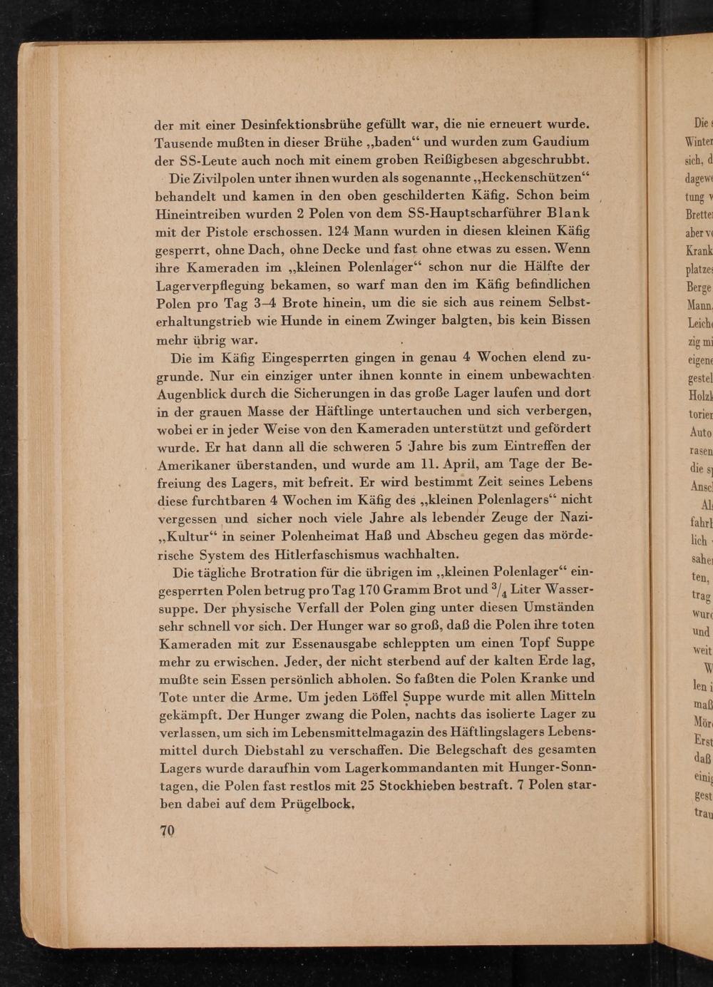 der mit einer Desinfektionsbrühe gefüllt war, die nie erneuert wurde. Tausende mußten in dieser Brühe ,, baden" und wurden zum Gaudium der SS - Leute auch noch mit einem groben Reißẞigbesen abgeschrubbt. Die Zivilpolen unter ihnen wurden als sogenannte ,, Heckenschützen" behandelt und kamen in den oben geschilderten Käfig. Schon beim Hineintreiben wurden 2 Polen von dem SS - Hauptscharführer Blank mit der Pistole erschossen. 124 Mann wurden in diesen kleinen Käfig gesperrt, ohne Dach, ohne Decke und fast ohne etwas zu essen. Wenn ihre Kameraden im ,, kleinen Polenlager" schon nur die Hälfte der Lagerverpflegung bekamen, so warf man den im Käfig befindlichen Polen pro Tag 3-4 Brote hinein, um die sie sich aus reinem Selbsterhaltungstrieb wie Hunde in einem Zwinger balgten, bis kein Bissen mehr übrig war.