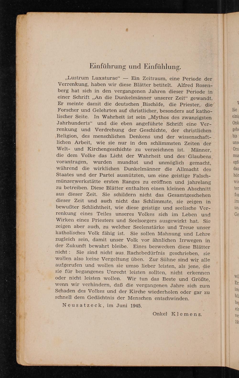 ,, Lustrum Luxaturae" Ein Zeitraum, eine Periode der Verrenkung, haben wir diese Blätter betitelt. Alfred Rosenberg hat sich in den vergangenen Jahren dieser Periode in einer Schrift ,, An die Dunkelmänner unserer Zeit" gewandt. Er meinte damit die deutschen Bischöfe, die Priester, die Forscher und Gelehrten auf christlicher, besonders auf katholischer Seite. In Wahrheit ist sein ,, Mythos des zwanzigsten Jahrhunderts" und die eben angeführte Schrift eine Verrenkung und Verdrehung der Geschichte, der christlichen Religion, des menschlichen Denkens und der wissenschaftlichen Arbeit, wie sie nur in den schlimmsten Zeiten der Welt- und Kirchengeschichte zu verzeichnen ist. Männer, die dem Volke das Licht der Wahrheit und des Glaubens vorantragen, wurden mundtot und unmöglich gemacht, während die wirklichen Dunkelmänner die Allmacht des Staates und der Partei ausnützten, um eine geistige Falschmünzerwerkstätte ersten Ranges zu eröffnen und jahrelang zu betreiben. Diese Blätter enthalten einen kleinen Abschnitt aus dieser Zeit. Sie schildern nicht das Gesamtgeschehen dieser Zeit und auch nicht das Schlimmste, sie zeigen in bewußter Schlichtheit, wie diese geistige und seelische Verrenkung eines Teiles unseres Volkes sich im Leben und Wirken eines Priesters und Seelsorgers ausgewirkt hat. Sie zeigen aber auch, zu welcher Seelenstärke und Treue unser katholisches Volk fähig ist. Sie sollen Mahnung und Lehre zugleich sein, damit unser Volk vor ähnlichen Irrwegen in der Zukunft bewahrt bleibe. Eines bezwecken diese Blätter nicht: Sie sind nicht aus. Rachebedürfnis geschrieben, sie wollen also keine Vergeltung üben. Zur Sühne sind wir alle aufgerufen und wollen sie umso lieber leisten, als jene, die sie für begangenes Unrecht leisten sollten, nicht erkennen oder nicht leisten wollen. Wir tun das Beste und Größte, wenn wir verhindern, daß die vergangenen Jahre sich zum Schaden des Volkes und der Kirche wiederholen oder gar zu schnell dem Gedächtnis der Menschen entschwinden.