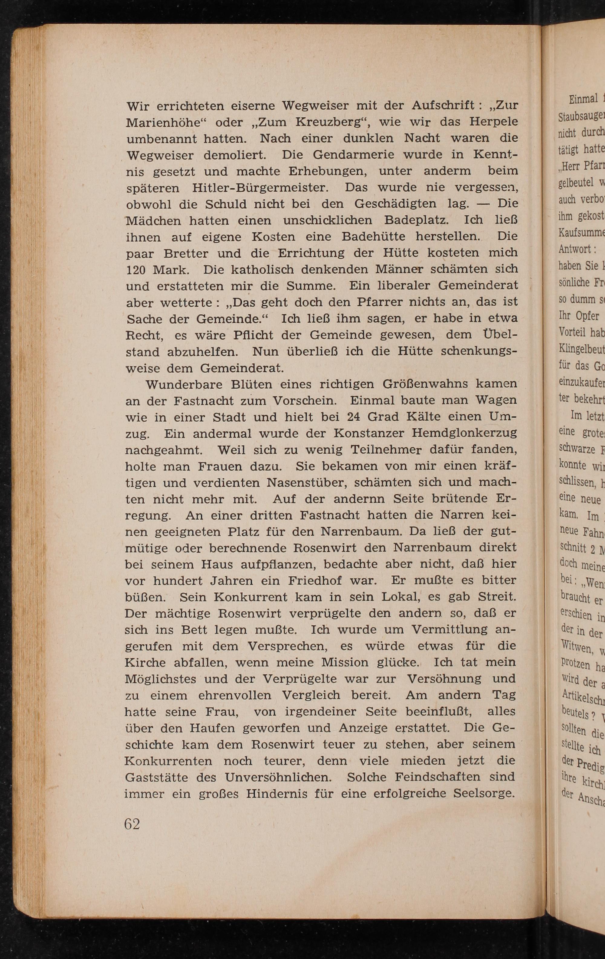 Wir errichteten eiserne Wegweiser mit der Aufschrift: ,, Zur Marienhöhe" oder„, Zum Kreuzberg", wie wir das Herpele umbenannt hatten. Nach einer dunklen Nacht waren die Wegweiser demoliert. Die Gendarmerie wurde in Kenntnis gesetzt und machte Erhebungen, unter anderm beim späteren Hitler - Bürgermeister. Das wurde nie vergessen, obwohl die Schuld nicht bei den Geschädigten lag. Die Mädchen hatten einen unschicklichen Badeplatz. Ich lieẞ ihnen auf eigene Kosten eine Badehütte herstellen. paar Bretter und die Errichtung der Hütte kosteten mich 120 Mark. Die katholisch denkenden Männer schämten sich und erstatteten mir die Summe. Ein liberaler Gemeinderat aber wetterte: ,, Das geht doch den Pfarrer nichts an, das ist Sache der Gemeinde." Ich ließ ihm sagen, er habe in etwa Recht, es wäre Pflicht der Gemeinde gewesen, dem Übelstand abzuhelfen. Nun überließ ich die Hütte schenkungsweise dem Gemeinderat.