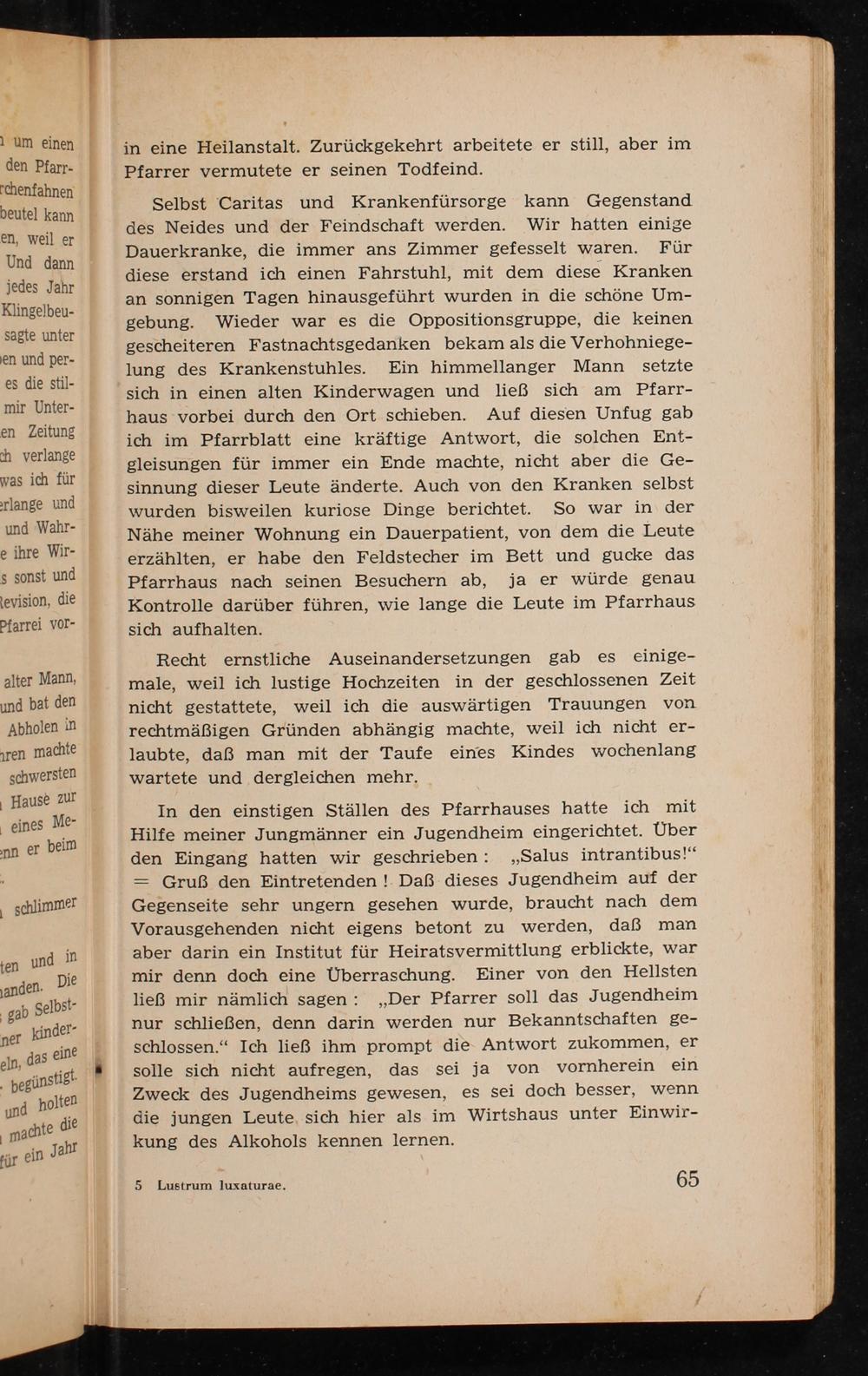 In den einstigen Ställen des Pfarrhauses hatte ich mit Hilfe meiner Jungmänner ein Jugendheim eingerichtet. Über den Eingang hatten wir geschrieben: ,, Salus intrantibus!" == Gruß den Eintretenden! Daß dieses Jugendheim auf der Gegenseite sehr ungern gesehen wurde, braucht nach dem Vorausgehenden nicht eigens betont zu werden, daß man aber darin ein Institut für Heiratsvermittlung erblickte, war mir denn doch eine Überraschung. Einer von den Hellsten lieẞ mir nämlich sagen:„ Der Pfarrer soll das Jugendheim nur schließen, denn darin werden nur Bekanntschaften geschlossen." Ich ließ ihm prompt die Antwort zukommen, er solle sich nicht aufregen, das sei ja von vornherein ein Zweck des Jugendheims gewesen, es sei doch besser, wenn die jungen Leute sich hier als im Wirtshaus unter Einwirkung des Alkohols kennen lernen.
