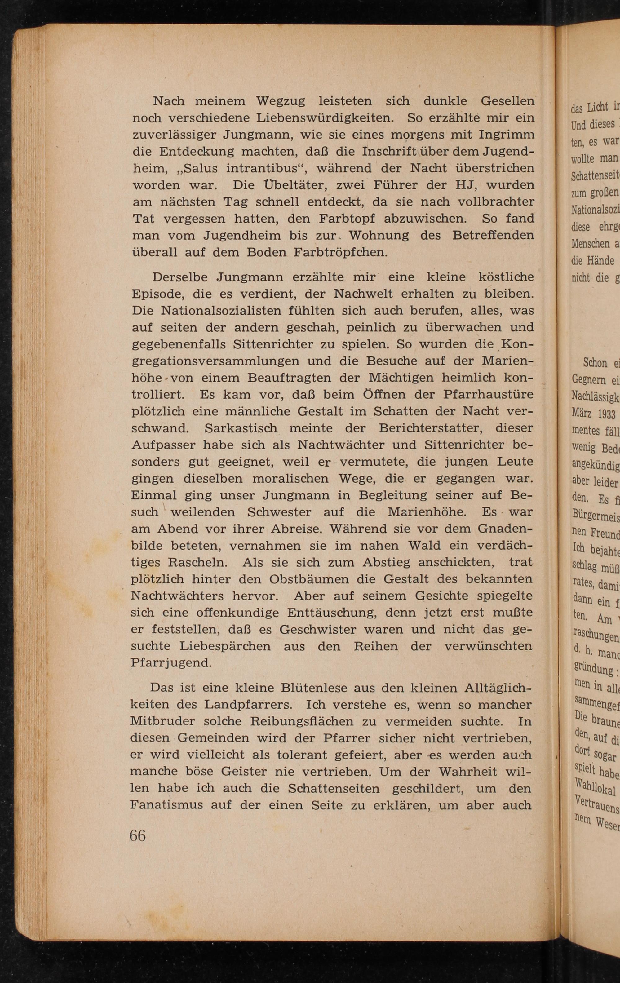 Derselbe Jungmann erzählte mir eine kleine köstliche Episode, die es verdient, der Nachwelt erhalten zu bleiben. Die Nationalsozialisten fühlten sich auch berufen, alles, was auf seiten der andern geschah, peinlich zu überwachen und gegebenenfalls Sittenrichter zu spielen. So wurden die Kongregationsversammlungen und die Besuche auf der Marienhöhe von einem Beauftragten der Mächtigen heimlich kontrolliert. Es kam vor, daß beim Öffnen der Pfarrhaustüre plötzlich eine männliche Gestalt im Schatten der Nacht verschwand. Sarkastisch meinte der Berichterstatter, dieser Aufpasser habe sich als Nachtwächter und Sittenrichter besonders gut geeignet, weil er vermutete, die jungen Leute gingen dieselben moralischen Wege, die er gegangen war. Einmal ging unser Jungmann in Begleitung seiner auf Besuch weilenden Schwester auf die Marienhöhe. Es war