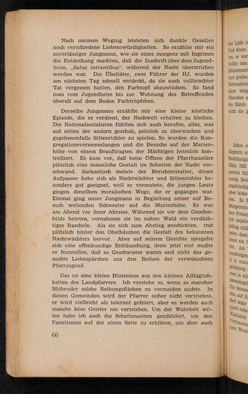 Das ist eine kleine Blütenlese aus den kleinen Alltäglichkeiten des Landpfarrers. Ich verstehe es, wenn so mancher Mitbruder solche Reibungsflächen zu vermeiden suchte. diesen Gemeinden wird der Pfarrer sicher nicht vertrieben, er wird vielleicht als tolerant gefeiert, aber es werden auch manche böse Geister nie vertrieben. Um der Wahrheit willen habe ich auch die Schattenseiten geschildert, um den Fanatismus auf der einen Seite zu erklären, um aber auch