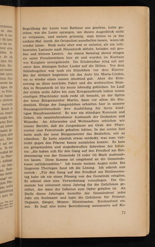 Begrüßung der Leute vom Rathaus aus gesehen, hatte gesehen, wie die Leute sprangen, um diesen Augenblick nicht zu verpassen, und meinte grimmig, man könne es ja das nächste Mal durch die Ortspolizei ausschellen lassen, wenn ich wieder käme. Noch mehr aber war er entsetzt, als ein vollbesetztes Lastauto nach Neusatzeck abfuhr, beladen mit groBen und kleinen Leuten. An einem Samstag abend stiegen sie unter Freudentränen hier ab und wurden im Kurhaus wie Kurgäste untergebracht. Die Kinderschar stieg mit mir unter dem Absingen froher Lieder auf die Höhen. Vor dem vor dem Kloster. Schlafengehen war noch ein Ständchen Bei der Abfahrt begleitete ich das Auto bis Maria- Linden, wo es wieder einen nassen Abschied gab. Aber die Erinnerung an diese herrliche Fahrt und die weihevollen Stunden in Neusatzeck ist bis heute lebendig geblieben. Im Lauf der ersten sechs Jahre bis zum Kriegsausbruch haben meine einstigen Pfarrkinder mich recht oft besucht, an der Spitze der treue Bürgermeister Martin, dann vor allem die Studentlein. Einige der Jungmädchen erhielten hier in unserer Hausangestelltenschule ihre Ausbildung für ihren künftigen Hausfrauenberuf. Es war ein ständiges Kommen und Gehen, ein ununterbrochener Austausch der Gedanken und Wünsche. An Allerseelen und Weihnachten erhielten wir immer Bericht, daß die Jungmänner am Grab der Pfarrmutter eine Feierstunde gehalten hätten. In der ersten Zeit hatte auch der neue Bürgermeister das Bedürfnis, mir zu schreiben. Er hatte nämlich etwas entdeckt, was man vielleicht gegen den Pfarrer famos ausspielen konnte. Es kam ein geharnischtes und siegesbewußtes Schreiben des Inhaltes: ,, Sie haben sich für den Gang auf den Friedhof am Heldensonntag von der Gemeinde 13( oder 14) Mark ausbezahlen lassen. Diese Summe ist umgehend an die Gemeindekasse zurückzuzahlen." Ich traute meinen Augen nicht. Bei längerem Überlegen fand ich die Lösung. Ich schrieb nun zurück ,, Für den Gang auf den Friedhof am Heldensonntag habe ich nie einen Pfennig von der Gemeinde erhalten. Es scheint aber eine Verwechslung vorzuliegen. Die Gemeinde hat seinerzeit einen Jahrtag für die Gefallenen gestiftet, der dann der Inflation zum Opfer gefallen ist. Stelle dieses Jahrtages bestellte der Gemeinderat jedes Jahr ein Seelenamt und legte die Gebühren für Priester, Organist, Sänger, Mesner, Ministranten, Kirchenfond etc. aus. Es liegt also keine Bereicherung meinerseits auf Ko