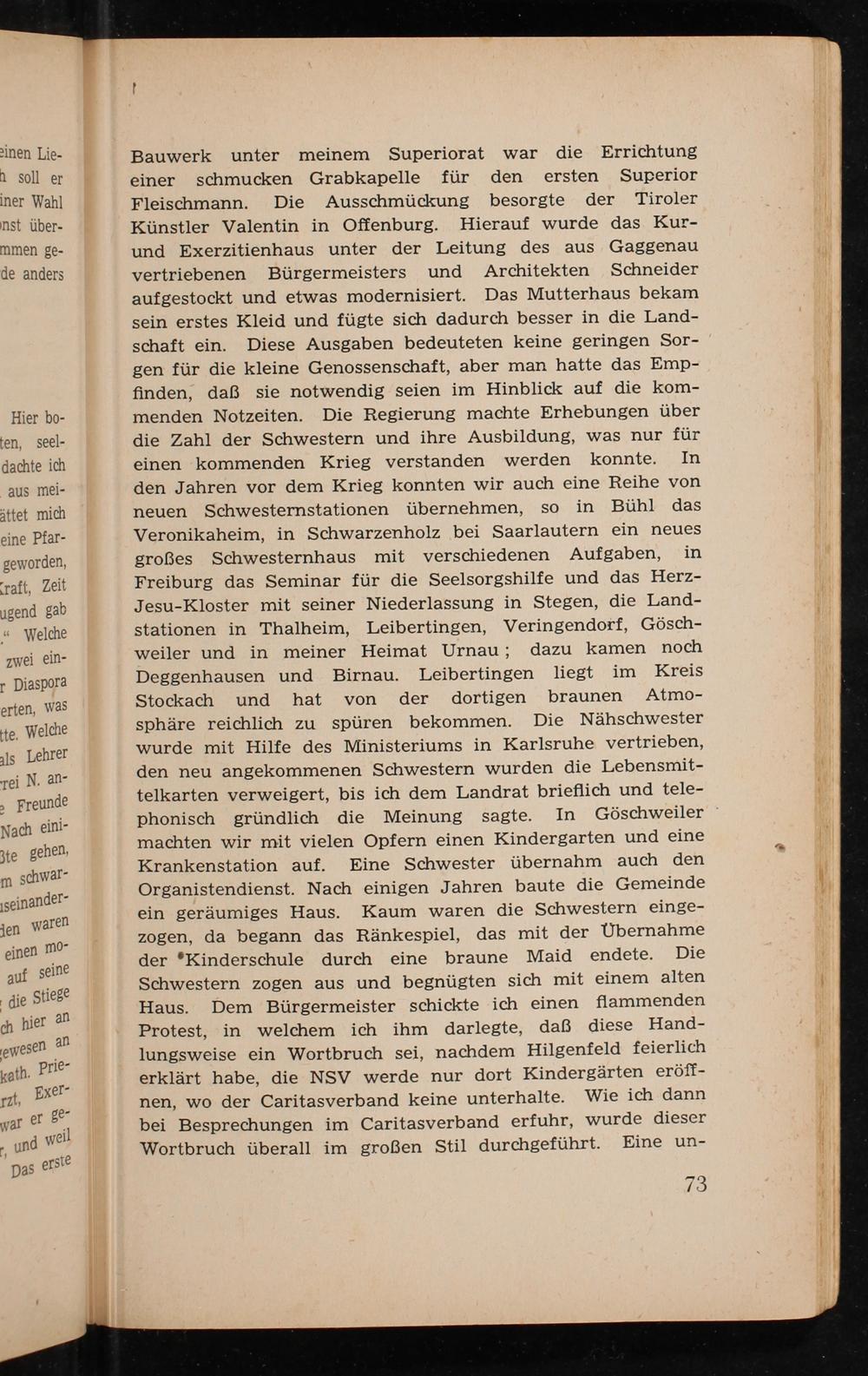 Bauwerk unter meinem Superiorat war die Errichtung einer schmucken Grabkapelle für den ersten Superior Fleischmann. Die Ausschmückung besorgte der Tiroler Künstler Valentin in Offenburg . Hierauf wurde das Kur- und Exerzitienhaus unter der Leitung des aus Gaggenau vertriebenen Bürgermeisters und Architekten Schneider aufgestockt und etwas modernisiert. Das Mutterhaus bekam sein erstes Kleid und fügte sich dadurch besser in die Land- schaft ein. Diese Ausgaben bedeuteten keine geringen Sor- gen für die kleine Genossenschaft, aber man hatte das Emp- finden, daß sie notwendig seien im Hinblick auf die kom- menden Notzeiten. Die Regierung machte Erhebungen über die Zahl der Schwestern und ihre Ausbildung, was nur für einen kommenden Krieg verstanden werden konnte. In den Jahren vor dem Krieg konnten wir auch eine Reihe von neuen Schwesternstationen übernehmen, so in Bühl das Veronikaheim, in Schwarzenholz bei Saarlautern ein neues großes Schwesternhaus mit verschiedenen Aufgaben, in Freiburg das Seminar für die Seelsorgshilfe und das Herz- Jesu-Kloster mit seiner Niederlassung in Stegen, die Land- stationen in Thalheim, Leibertingen, Veringendotf, Gösch- weiler und in meiner Heimat Urnau; dazu kamen noch Deggenhausen und Birnau . Leibertingen liegt im Kreis Stockach und hat von der dortigen braunen Atmo- sphäre reichlich zu spüren bekommen. Die Nähschwester wurde mit Hilfe des Ministeriums in Karlsruhe vertrieben, den neu angekommenen Schwestern wurden die Lebensmit- telkarten verweigert, bis ich dem Landrat brieflich und tele- phonisch gründlich die Meinung sagte. In Göschweiler machten wir mit vielen Opfern einen Kindergarten und eine Krankenstation auf. Eine Schwester übernahm auch den Organistendienst. Nach einigen Jahren baute die Gemeinde ein geräumiges Haus. Kaum waren die Schwestern einge- zogen, da begann das Ränkespiel, das mit der Übernahme der*Kinderschule durch eine braune Maid endete. Die Schwestern zogen aus und begnügten sich mit einem alten Haus. Dem Bürgermeister schickte ich einen flammenden Protest, in welchem ich ihm darlegte, daß diese Hand- lungsweise ein Wortbruch sei, nachdem Hilgenfeld feierlich erklärt habe, die NSV werde nur dort Kindergärten eröff- nen, wo der Caritasverband keine unterhalte. Wie ich dann bei Besprechungen im Caritasverband erfuhr, wurde dieser Wortbruch überall im großen Stil durchgeführt. Eine un-