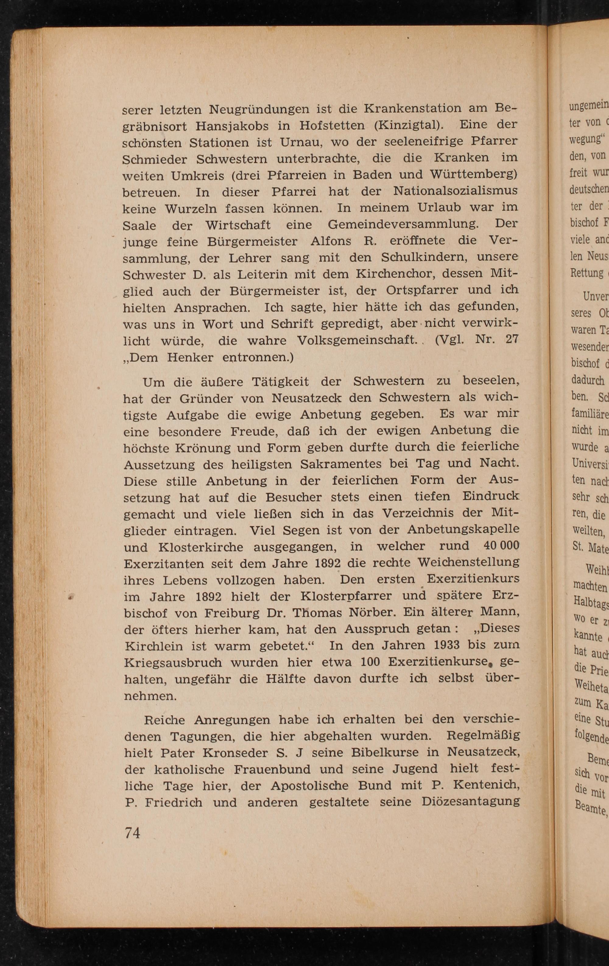 Um die äußere Tätigkeit der Schwestern zu beseelen, hat der Gründer von Neusatzeck den Schwestern als wichtigste Aufgabe die ewige Anbetung gegeben. Es war mir eine besondere Freude, daß ich der ewigen Anbetung die höchste Krönung und Form geben durfte durch die feierliche Aussetzung des heiligsten Sakramentes bei Tag und Nacht. Diese stille Anbetung in der feierlichen Form der Aussetzung hat auf die Besucher stets einen tiefen Eindruck gemacht und viele ließen sich in das Verzeichnis der Mitglieder eintragen. Viel Segen ist von der Anbetungskapelle und Klosterkirche ausgegangen, in welcher rund 40 000 Exerzitanten seit dem Jahre 1892 die rechte Weichenstellung ihres Lebens vollzogen haben. Den ersten Exerzitienkurs im Jahre 1892 hielt der Klosterpfarrer und spätere Erzbischof von Freiburg Dr. Thomas Nörber . Ein älterer Mann, der öfters hierher kam, hat den Ausspruch getan: ,, Dieses Kirchlein ist warm gebetet." In den Jahren 1933 bis zum Kriegsausbruch wurden hier etwa 100 Exerzitienkurse, gehalten, ungefähr die Hälfte davon durfte ich selbst übernehmen.