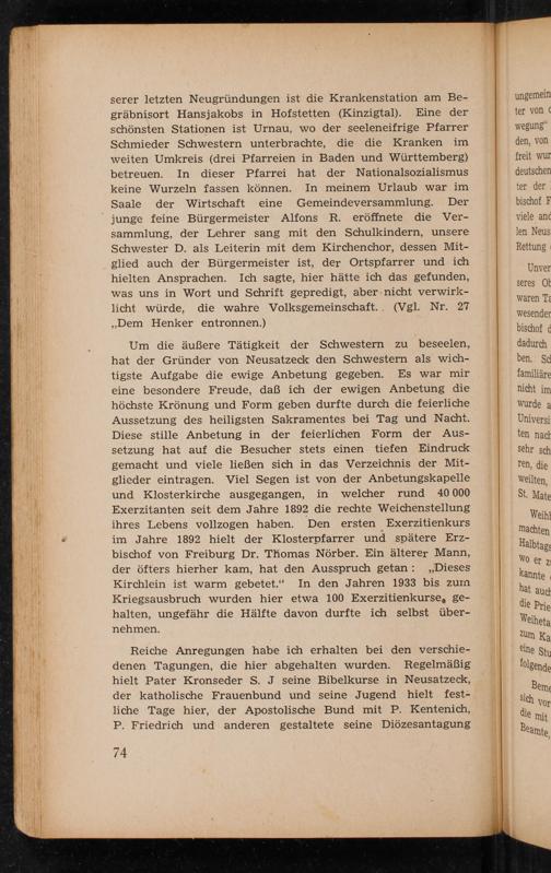 serer letzten Neugründungen ist die Krankenstation am Begräbnisort Hansjakobs in Hofstetten ( Kinzigtal). Eine der schönsten Stationen ist Urnau, wo der seeleneifrige Pfarrer Schmieder Schwestern unterbrachte, die die Kranken im weiten Umkreis( drei Pfarreien in Baden und Württemberg ) betreuen. In dieser Pfarrei hat der Nationalsozialismus keine Wurzeln fassen können. In meinem Urlaub war im Saale der Wirtschaft eine Gemeindeversammlung. junge feine Bürgermeister Alfons R. eröffnete die Versammlung, der Lehrer sang mit den Schulkindern, unsere Schwester D. als Leiterin mit dem Kirchenchor, dessen Mitglied auch der Bürgermeister ist, der Ortspfarrer und ich hielten Ansprachen. Ich sagte, hier hätte ich das gefunden, was uns in Wort und Schrift gepredigt, aber nicht verwirklicht würde, die wahre Volksgemeinschaft. ,, Dem Henker entronnen.)