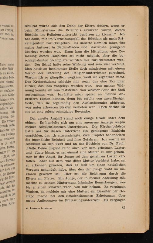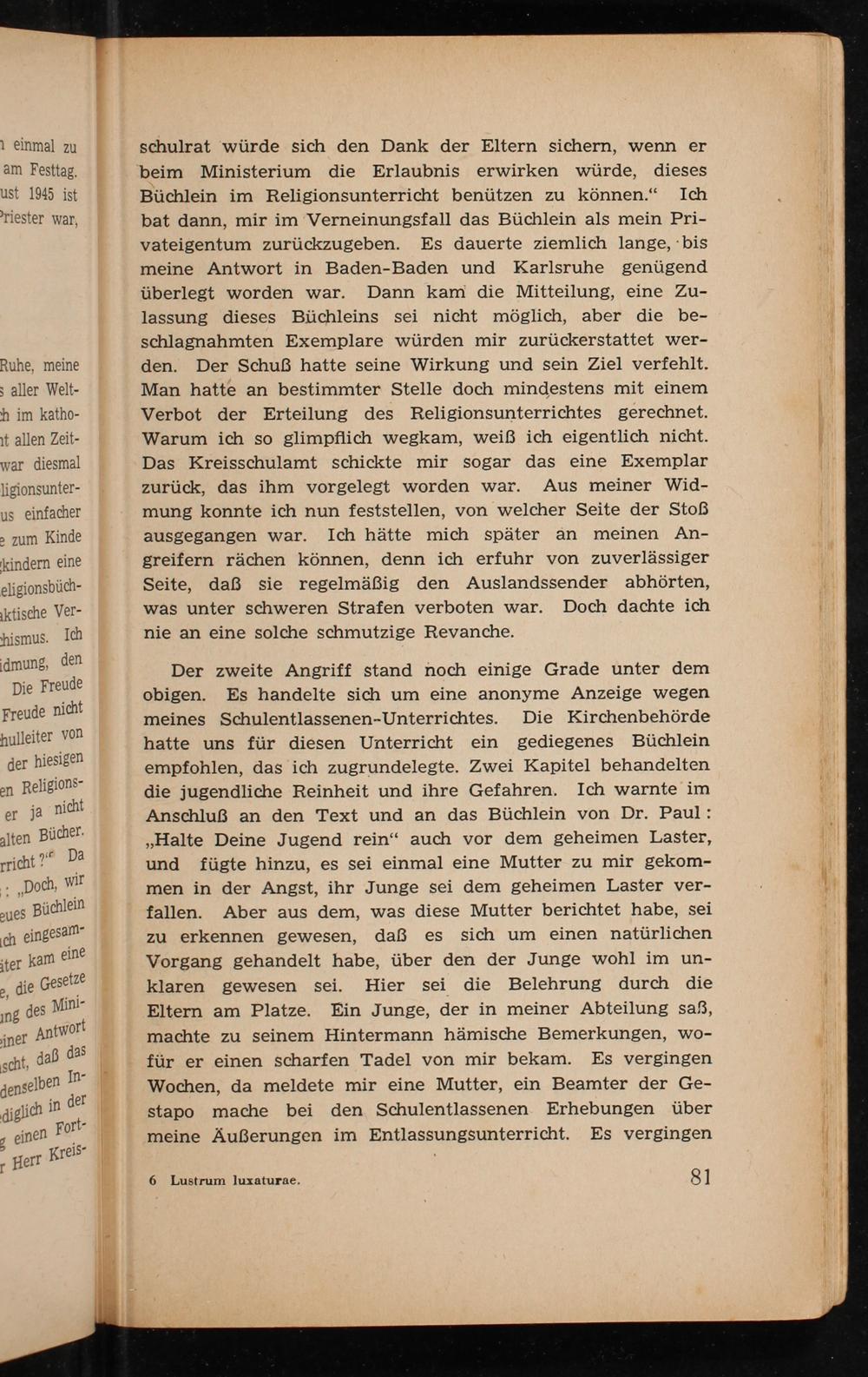 schulrat würde sich den Dank der Eltern sichern, wenn er beim Ministerium die Erlaubnis erwirken würde, dieses Büchlein im Religionsunterricht benützen zu können." Ich bat dann, mir im Verneinungsfall das Büchlein als mein Privateigentum zurückzugeben. Es dauerte ziemlich lange, bis meine Antwort in Baden- Baden und Karlsruhe genügend überlegt worden war. Dann kam die Mitteilung, eine Zulassung dieses Büchleins sei nicht möglich, aber die beschlagnahmten Exemplare würden mir zurückerstattet werden. Der Schuß hatte seine Wirkung und sein Ziel verfehlt. Man hatte an bestimmter Stelle doch mindestens mit einem Verbot der Erteilung des Religionsunterrichtes gerechnet. Warum ich so glimpflich wegkam, weiß ich eigentlich nicht. Das Kreisschulamt schickte mir sogar das eine Exemplar zurück, das ihm vorgelegt worden war. Aus meiner Widmung konnte ich nun feststellen, von welcher Seite der Stoẞ ausgegangen war. Ich hätte mich später an meinen Angreifern rächen können, denn ich erfuhr von zuverlässiger Seite, daß sie regelmäßig den Auslandssender abhörten, was unter schweren Strafen verboten war. Doch dachte ich nie an eine solche schmutzige Revanche.