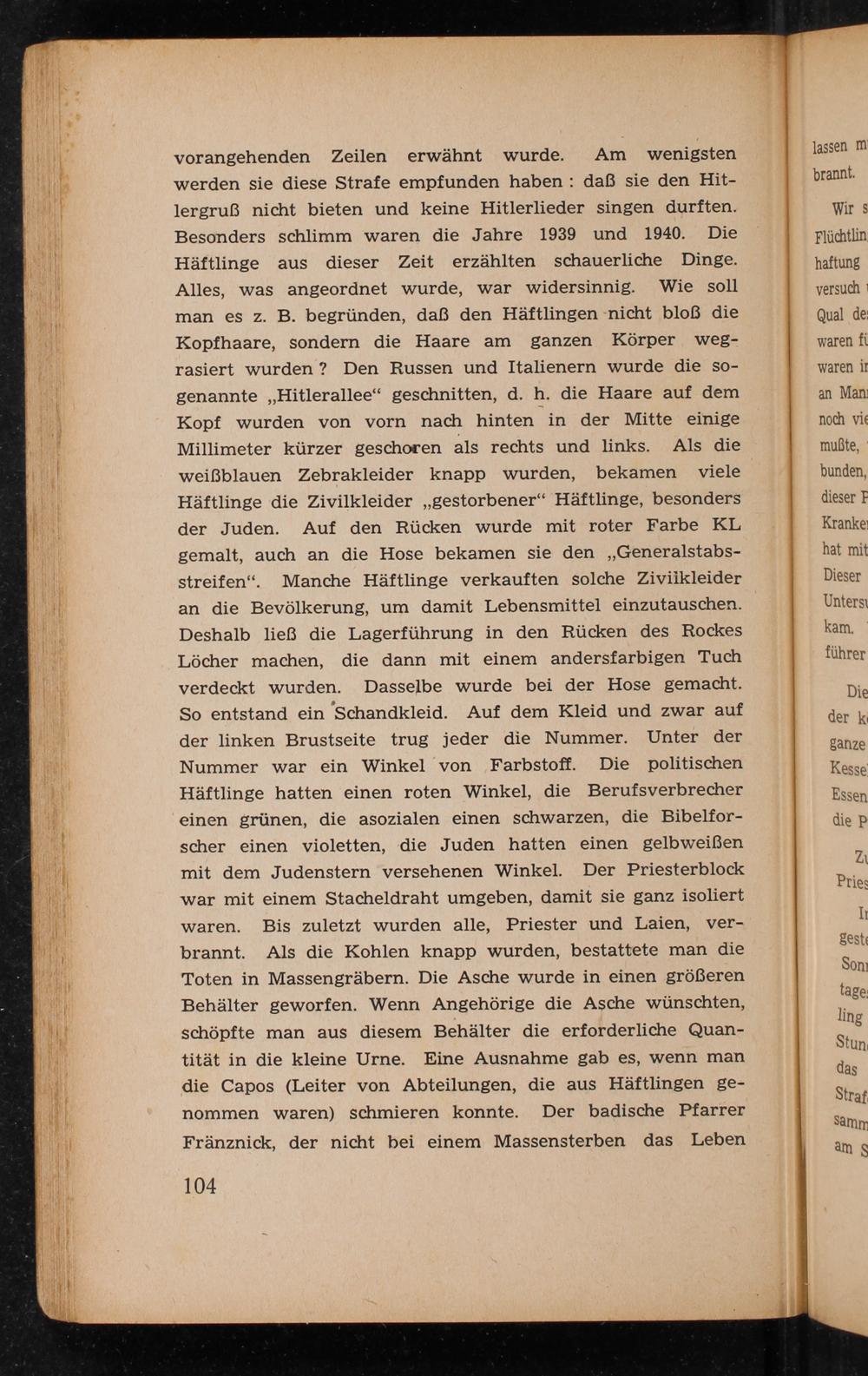 vorangehenden Zeilen erwähnt wurde. Am wenigsten werden sie diese Strafe empfunden haben: daß sie den Hitlergruß nicht bieten und keine Hitlerlieder singen durften. Besonders schlimm waren die Jahre 1939 und 1940. Die Häftlinge aus dieser Zeit erzählten schauerliche Dinge. Alles, was angeordnet wurde, war widersinnig. Wie soll man es z. B. begründen, daß den Häftlingen nicht bloß die Kopfhaare, sondern die Haare am ganzen Körper wegrasiert wurden? Den Russen und Italienern wurde die sogenannte ,, Hitlerallee" geschnitten, d. h. die Haare auf dem Kopf wurden von vorn nach hinten in der Mitte einige Millimeter kürzer geschoren als rechts und links. Als die weißblauen Zebrakleider knapp wurden, bekamen viele Häftlinge die Zivilkleider„ gestorbener" Häftlinge, besonders der Juden. Auf den Rücken wurde mit roter Farbe KL gemalt, auch an die Hose bekamen sie den ,, Generalstabsstreifen". Manche Häftlinge verkauften solche Zivilkleider an die Bevölkerung, um damit Lebensmittel einzutauschen. Deshalb ließ die Lagerführung in den Rücken des Rockes Löcher machen, die dann mit einem andersfarbigen Tuch verdeckt wurden. Dasselbe wurde bei der Hose gemacht. So entstand ein Schandkleid. Auf dem Kleid und zwar auf der linken Brustseite trug jeder die Nummer. Unter der Nummer war ein Winkel von Farbstoff. Die politischen Häftlinge hatten einen roten Winkel, die Berufsverbrecher einen grünen, die asozialen einen schwarzen, die Bibelforscher einen violetten, die Juden hatten einen gelb weißen mit dem Judenstern versehenen Winkel. Der Priesterblock war mit einem Stacheldraht umgeben, damit sie ganz isoliert waren. Bis zuletzt wurden alle, Priester und Laien, verbrannt. Als die Kohlen knapp wurden, bestattete man die Toten in Massengräbern. Die Asche wurde in einen größeren Behälter geworfen. Wenn Angehörige die Asche wünschten, schöpfte man aus diesem Behälter die erforderliche Quantität in die kleine Urne. Eine Ausnahme gab es, wenn man die Capos( Leiter von Abteilungen, die aus Häftlingen genommen waren) schmieren konnte. Der badische Pfarrer Fränznick, der nicht bei einem Massensterben das Leben