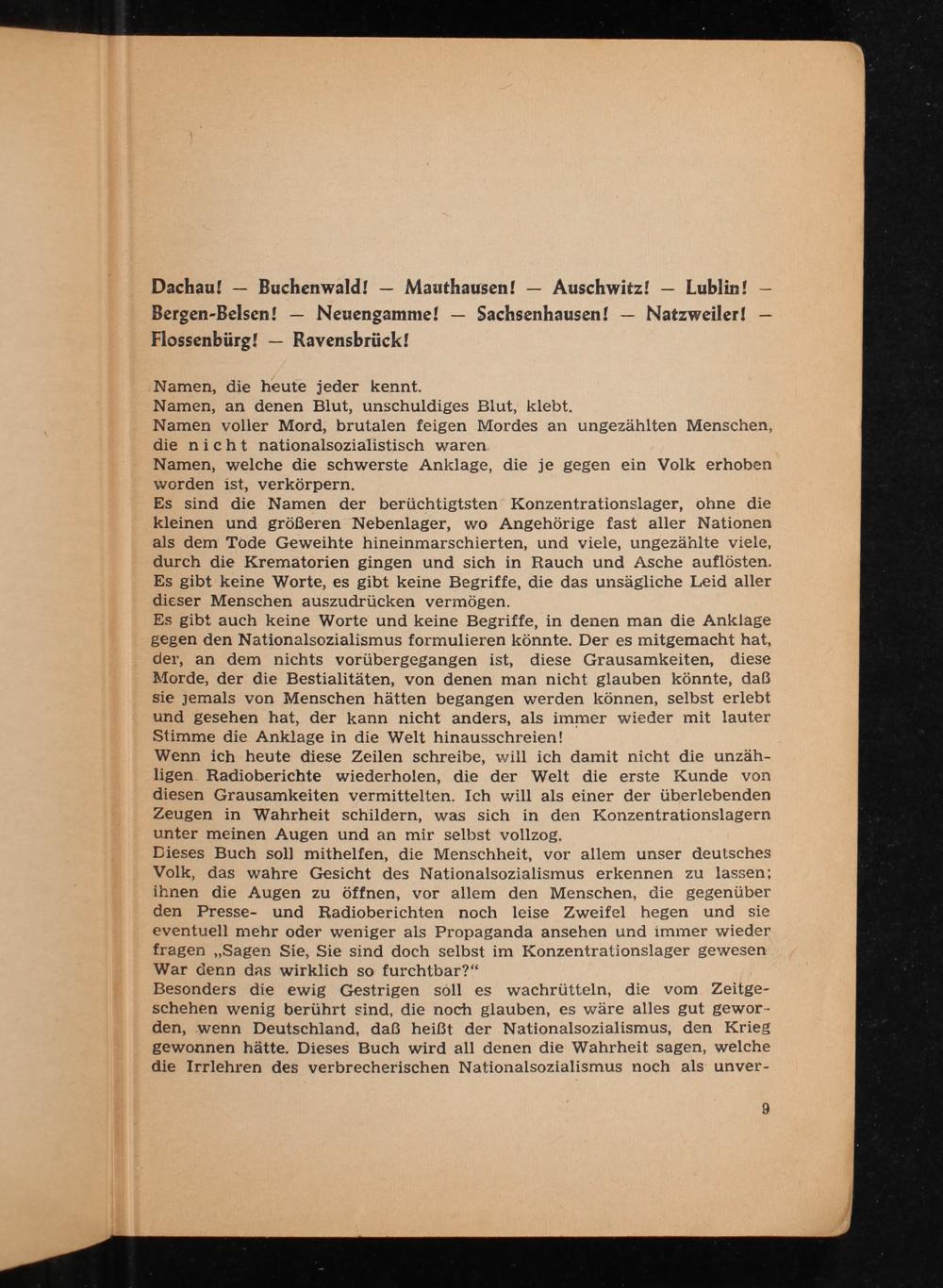 Wenn ich heute diese Zeilen schreibe, will ich damit nicht die unzähligen Radioberichte wiederholen, die der Welt die erste Kunde von diesen Grausamkeiten vermittelten. Ich will als einer der überlebenden Zeugen in Wahrheit schildern, was sich in den Konzentrationslagern unter meinen Augen und an mir selbst vollzog.