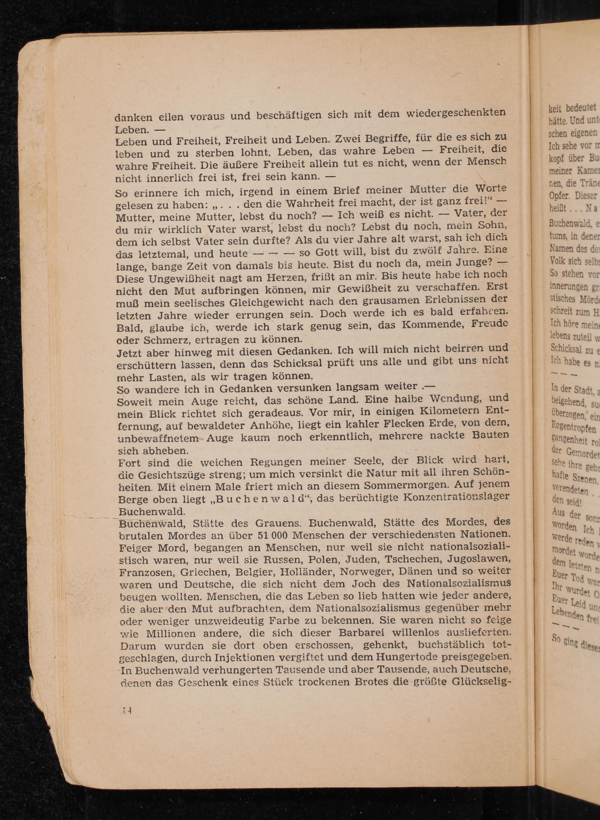 Buchenwald, Stätte des Grauens. Buchenwald , Stätte des Mordes, des brutalen Mordes an über 51 000 Menschen der verschiedensten Nationen. Feiger Mord, begangen an Menschen, nur weil sie nicht nationalsozialistisch waren, nur weil sie Russen, Polen, Juden, Tschechen, Jugoslawen, Franzosen , Griechen, Belgier, Holländer, Norweger, Dänen und so weiter waren und Deutsche , die sich nicht dem Joch des Nationalsozialismus beugen wollten. Menschen, die das Leben so lieb hatten wie jeder andere, die aber den Mut aufbrachten, dem Nationalsozialismus gegenüber mehr oder weniger unzweideutig Farbe zu bekennen. Sie waren nicht so feige wie Millionen andere, die sich dieser Barbarei willenlos auslieferten. Darum wurden sie dort oben erschossen, gehenkt, buchstäblich totgeschlagen, durch Injektionen vergiftet und dem Hungertode preisgegeben. In Buchenwald verhungerten Tausende und aber Tausende, auch Deutsche , denen das Geschenk eines Stück trockenen Brotes die größte Glückselig