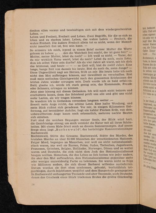 Fort sind die weichen Regungen meiner Seele, der Blick wird hart, die Gesichtszüge streng; um mich versinkt die Natur mit all ihren Schönheiten. Mit einem Male friert mich an diesem Sommermorgen. Auf jenem Berge oben liegt ,, Buchenwald ", das berüchtigte Konzentrationslager Buchenwald.