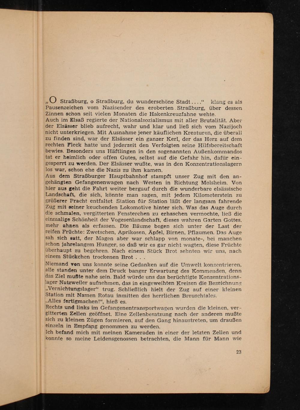 Aus dem Straßburger Hauptbahnhof stampft unser Zug mit den an- gehängten Gefangenenwagen nach Westen in Richtung Molsheim . Von hier aus geht die Fahrt weiter bergauf durch die wunderbare elsässische Landschaft, die sich, könnte man sagen, mit jedem Kilometerstein zu größerer Pracht entfaltet Station für Station läßt der langsam fahrende Zug mit seiner keuchenden Lokomotive hinter sich. Was das Auge durch die schmalen, vergitterten Fensterchen zu erhaschen vermochte, ließ die einmalige Schönheit der Vogesenlandschaft, dieses wahren Garten Gottes, mehr ahnen als erfassen. Die Bäume bogen sich unter der Last der reifen Früchte: Zwetschen, Aprikosen, Äpfel, Birnen, Pflaumen. Das Auge sah sich satt, der Magen aber war schlapp von monate-, bei manchen schon jahrelangem Hunger, so daß wir es gar nicht wagten, diese Früchte überhaupt zu begehren. Nach einem Stück Brot sehnten wir uns, nach einem Stückchen trockenen Brot...