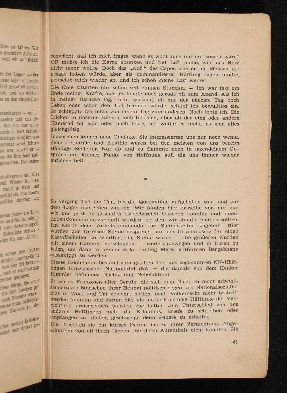 Himmler befohlene Nacht- und Nebelaktion). Es waren Franzosen aller Berufe, die sich dem Nazijoch nicht gebeugt, sondern als Menschen ihrer Heimat politisch gegen den Nationalsozialismus in Wort und Tat gewehrt hatten, nach Völkerrecht nicht bestraft werden konnten und darum hier als unbekannte Häftlinge der Vernichtung preisgegeben wurden. Sie hatten zum Unterschied von uns anderen Häftlingen nicht zu die Erlaubnis, Briefe schreiben oder