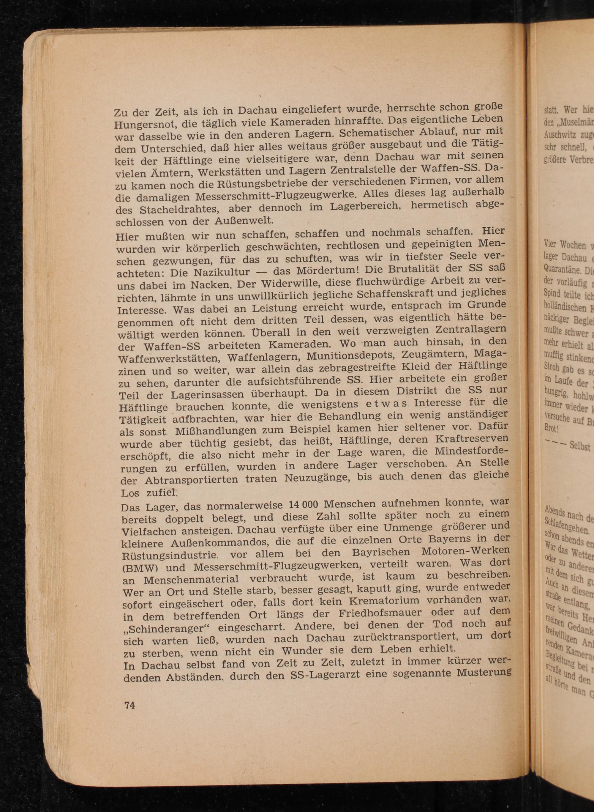 Zu der Zeit, als ich in Dachau eingeliefert wurde, herrschte schon große Hungersnot, die täglich viele Kameraden hinraffte. Das eigentliche Leben war dasselbe wie in den anderen Lagern. Schematischer Ablauf, nur mit dem Unterschied, daß hier alles weitaus größer ausgebaut und die Tätigkeit der Häftlinge eine vielseitigere war, denn Dachau war mit seinen vielen Ämtern, Werkstätten und Lagern Zentralstelle der Waffen- SS . Dazu kamen noch die Rüstungsbetriebe der verschiedenen Firmen, vor allem die damaligen Messerschmitt- Flugzeugwerke. Alles dieses lag außerhalb des Stacheldrahtes, aber dennoch im Lagerbereich, hermetisch abgeschlossen von der Außenwelt.