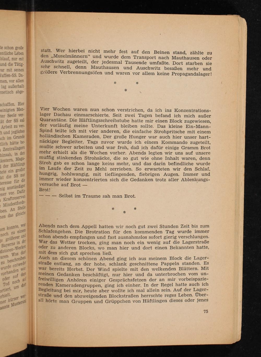 Vier Wochen waren nun schon verstrichen, da ich ins Konzentrations- lager Dachau einmarschierte, Seit zwei Tagen befand ich mich außer Quarantäne. Die Häftlingsschreibstube hatte mir einen Block zugewiesen, der vorläufig meine Unterkunft bleiben sollte. Das kleine Ein-Mann- Spind teilte ich mit vier anderen, die einfache Strohpritsche mit einem holländischen Kameraden. Der große Hunger war auch hier unser hart- näckiger Begleiter. Tags zuvor wurde ich einem Kommando zugeteilt, mußte schwer arbeiten und war froh, daß ich dafür einige Gramm Brot mehr erhielt als die Wochen vorher. Abends legten wir uns auf unsere muffig stinkenden Strohsäcke, die so gut wie ohne Inhalt waren, denn Stroh gab es schon lange keins mehr, und das darin befindliche wurde im Laufe der Zeit zu Mehl zerrieben. So erwarteten wir den Schlaf, hungrig, hohlwangig, mit tiefliegenden, fiebrigen Augen. Immer und immer wieder konzentrierten sich die Gedanken trotz aller Ablenkungs- versuche auf Brot—