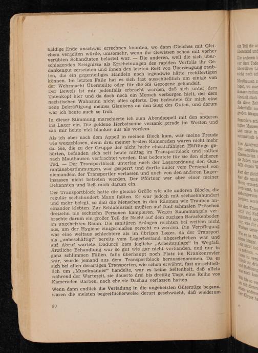 Als ich aber nach dem Appell in meinen Block kam, war meine Freude wie weggeblasen, denn drei meiner besten Kameraden waren nicht mehr da. Sie, die zu der Gruppe der nicht mehr einsatzfähigen Häftlinge gehörten, befanden sich seit heute mittag im Transportblock und sollten nach Mauthausen verfrachtet werden. Das bedeutete für sie den sicheren Tod. Der Transportblock unterlag nach der Lagerordnung den Quarantänebestimmungen, war gesperrt und durfte außer vom Personal von niemandem der Transportler verlassen und auch von den anderen Lagerinsassen nicht betreten werden. Der Pförtner war aber einer meiner Bekannten und ließ mich darum ein.