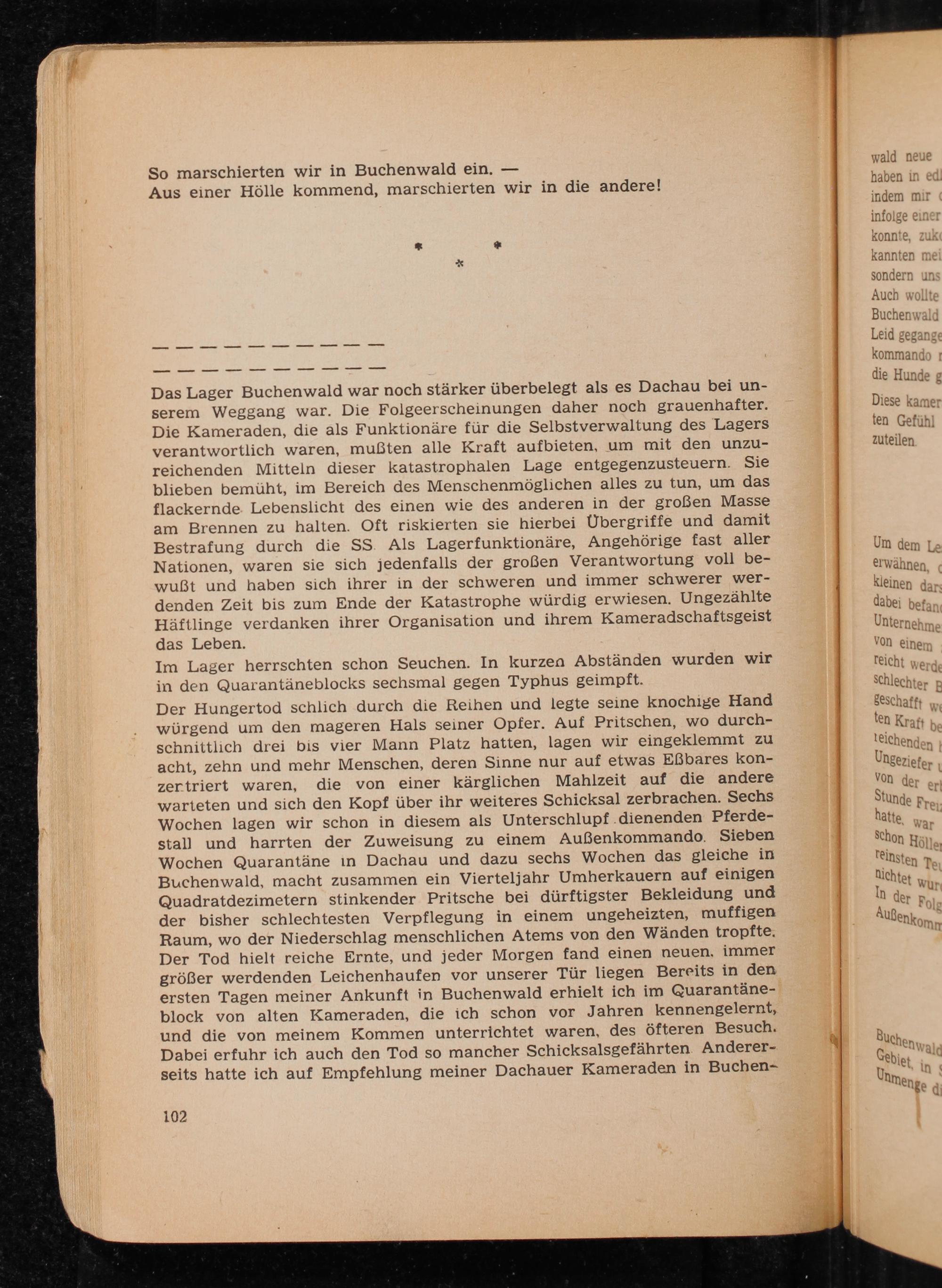 Der Hungertod schlich durch die Reihen und legte seine knochige Hand würgend um den mageren Hals seiner Opfer. Auf Pritschen, wo durchschnittlich drei bis vier Mann Platz hatten, lagen wir eingeklemmt zu acht, zehn und mehr Menschen, deren Sinne nur auf etwas Eßbares konzertriert waren, die von einer kärglichen Mahlzeit auf die andere warteten und sich den Kopf über ihr weiteres Schicksal zerbrachen. Sechs Wochen lagen wir schon in diesem als Unterschlupf dienenden Pferdestall und harrten der Zuweisung zu einem Außenkommando. Sieben Wochen Quarantäne in Dachau und dazu sechs Wochen das gleiche in Buchenwald , macht zusammen ein Vierteljahr Umherkauern auf einigen Quadratdezimetern stinkender Pritsche bei dürftigster Bekleidung und der bisher schlechtesten Verpflegung in einem ungeheizten, muffigen Raum, wo der Niederschlag menschlichen Atems von den Wänden tropfte. Der Tod hielt reiche Ernte, und jeder Morgen fand einen neuen, immer größer werdenden Leichenhaufen vor unserer Tür liegen Bereits in den ersten Tagen meiner Ankunft in Buchenwald erhielt ich im Quarantäneblock von alten Kameraden, die ich schon vor Jahren kennengelernt, und die von meinem Kommen unterrichtet waren, des öfteren Besuch. Dabei erfuhr ich auch den Tod so mancher Schicksalsgefährten Andererseits hatte ich auf Empfehlung meiner Dachauer Kameraden in Buchen
