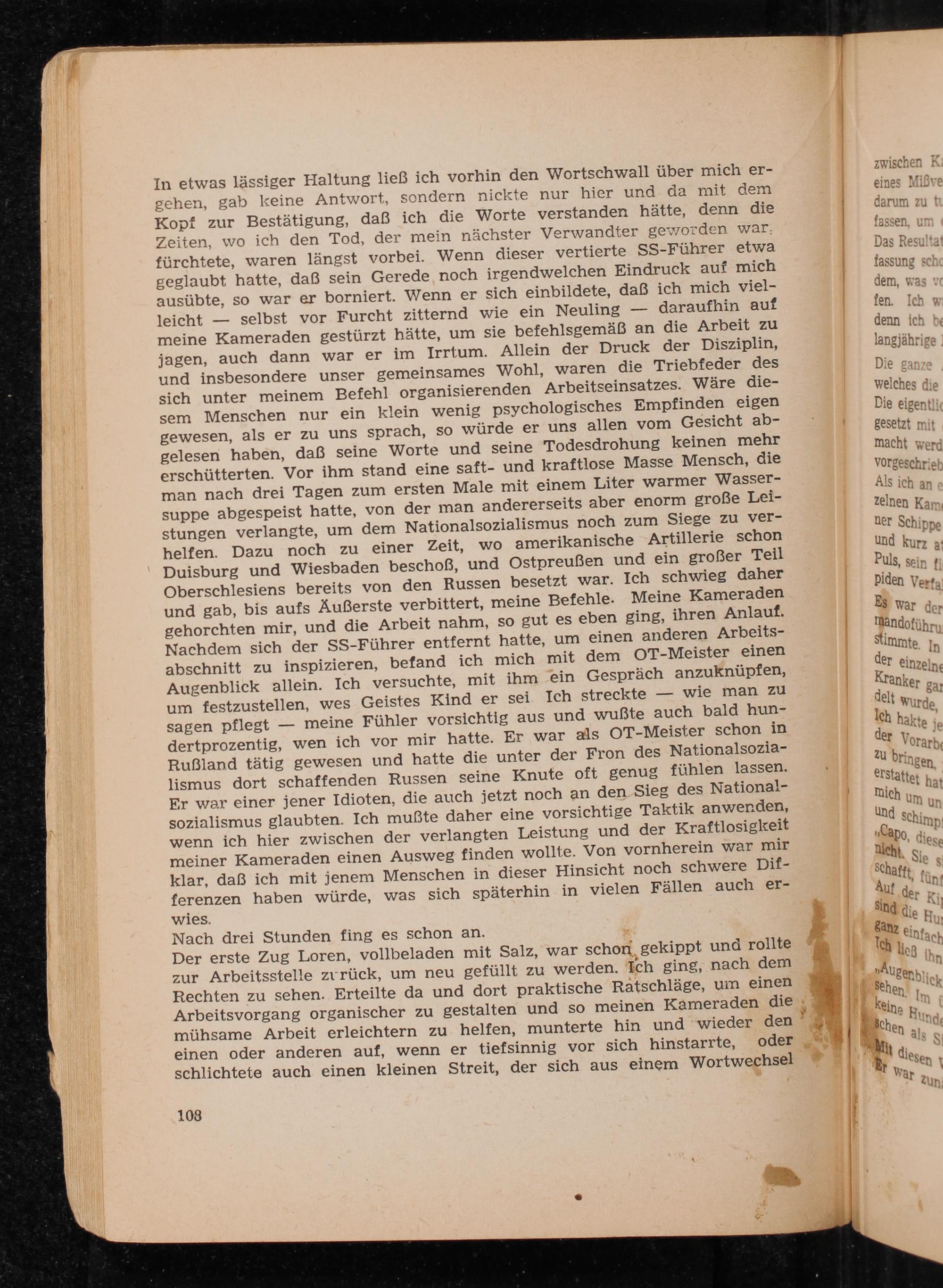 Der erste Zug Loren, vollbeladen mit Salz, war schon gekippt und rollte zur Arbeitsstelle zurück, um neu gefüllt zu werden. Ich ging, nach dem Rechten zu sehen. Erteilte da und dort praktische Ratschläge, um einen Arbeitsvorgang organischer zu gestalten und so meinen Kameraden die mühsame Arbeit erleichtern zu helfen, munterte hin und wieder den einen oder anderen auf, wenn er tiefsinnig vor sich hinstarrte, schlichtete auch einen kleinen Streit, der sich aus einem Wortwechsel