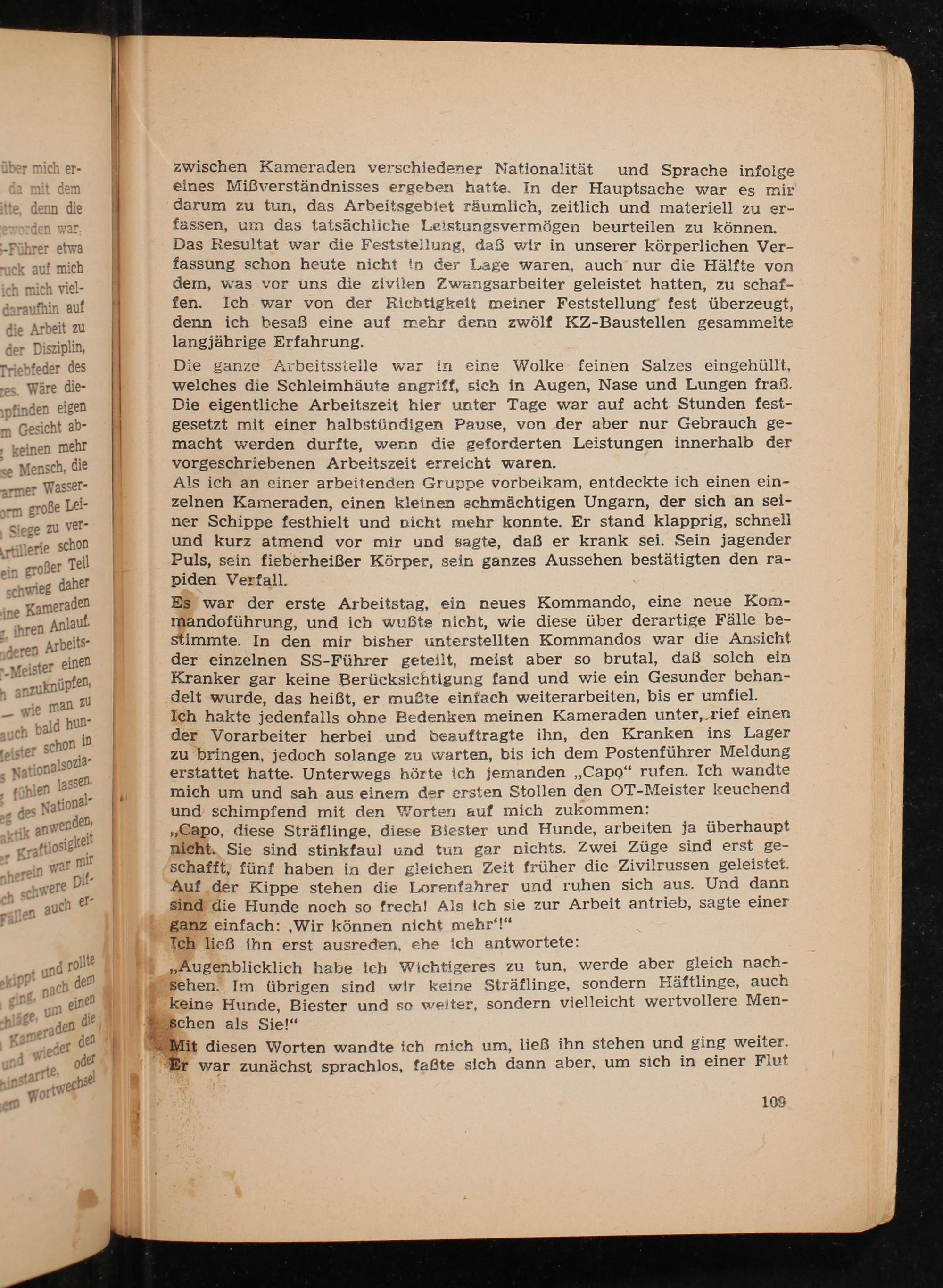 ,, Capo, diese Sträflinge, diese Biester und Hunde, arbeiten ja überhaupt nicht. Sie sind stinkfaul und tun gar nichts. Zwei Züge sind erst geschafft, fünf haben in der gleichen Zeit früher die Zivilrussen geleistet. Auf der Kippe stehen die Lorenfahrer und ruhen sich aus. Und dann sind die Hunde noch so frech! Als ich sie zur Arbeit antrieb, sagte einer ganz einfach: Wir können nicht mehr'!"
