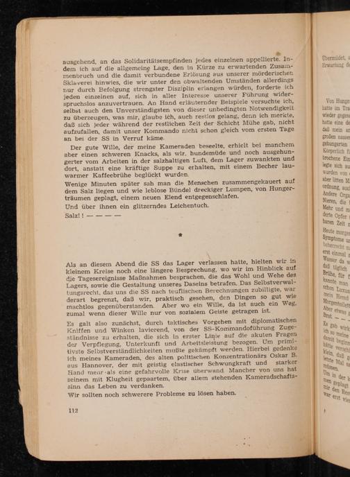 ausgehend, an das Solidaritätsempfinden jedes einzelnen appellierte. Indem ich auf die allgemeine Lage, den in Kürze zu erwartenden Zusammenbruch und die damit verbundene Erlösung aus unserer mörderischen Sklaverei hinwies, die wir unter den obwaltenden Umständen allerdings nur durch Befolgung strengster Disziplin erlangen würden, forderte ich jeden einzelnen auf, sich in aller Interesse unserer Führung widerspruchslos anzuvertrauen. An Hand erläuternder Beispiele versuchte ich, selbst auch den Unverständigsten von dieser unbedingten Notwendigkeit zu überzeugen, was mir, glaube ich, auch restlos gelang, denn ich merkte, daß sich jeder während der restlichen Zeit der Schicht Mühe gab, nicht aufzufallen, damit unser Kommando nicht schon gleich vom ersten Tage an bei der SS in Verruf käme.