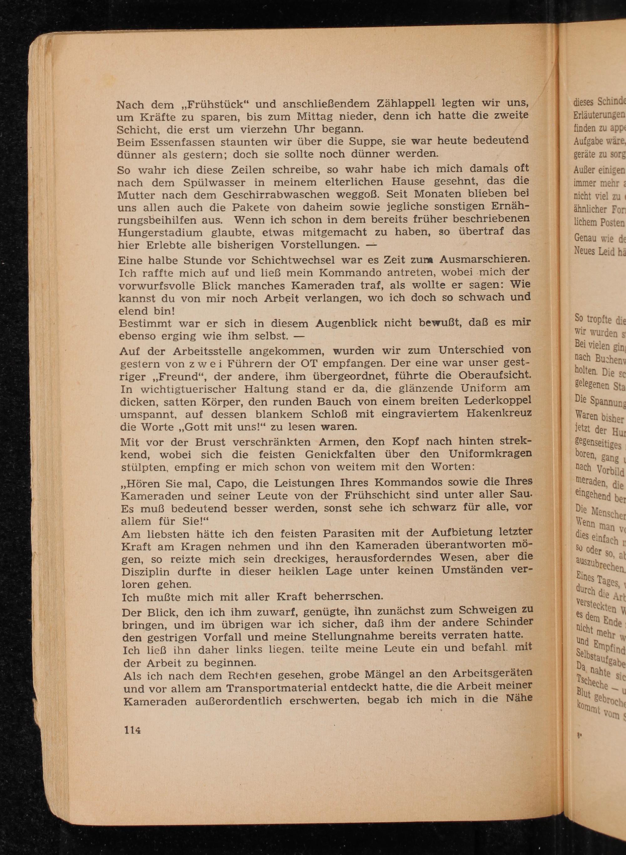 Auf der Arbeitsstelle angekommen, wurden wir zum Unterschied von gestern von zwei Führern der OT empfangen. Der eine war unser gestriger ,, Freund", der andere, ihm übergeordnet, führte die Oberaufsicht. In wichtigtuerischer Haltung stand er da, die glänzende Uniform am dicken, satten Körper, den runden Bauch von einem breiten Lederkoppel umspannt, auf dessen blankem Schloß mit eingraviertem Hakenkreuz die Worte ,, Gott mit uns!" zu lesen waren.