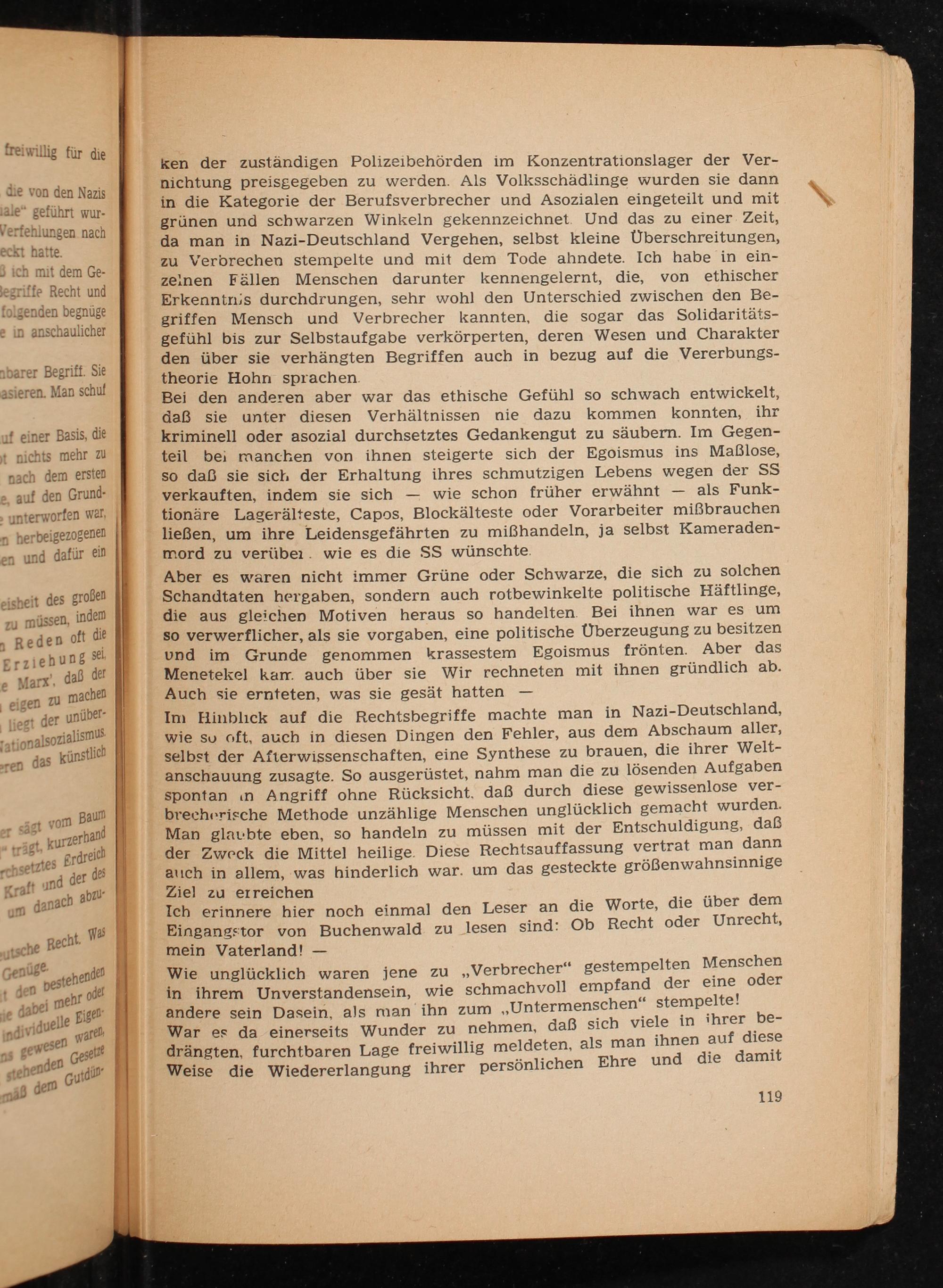 Im Hinblick auf die Rechtsbegriffe machte man in Nazi- Deutschland, wie so oft, auch in diesen Dingen den Fehler, aus dem Abschaum aller, selbst der Afterwissenschaften, eine Synthese zu brauen, die ihrer Weltanschauung zusagte. So ausgerüstet, nahm man die zu lösenden Aufgaben spontan in Angriff ohne Rücksicht, daß durch diese gewissenlose verbrecherische Methode unzählige Menschen unglücklich gemacht wurden. Man glaubte eben, so handeln zu müssen mit der Entschuldigung, daß der Zweck die Mittel heilige. Diese Rechtsauffassung vertrat man dann auch in allem, was hinderlich war. um das gesteckte größenwahnsinnige Ziel zu erreichen Ich erinnere hier noch einmal den Leser an die Worte, die über dem Eingangstor von Buchenwald zu lesen sind: Ob Recht oder Unrecht,