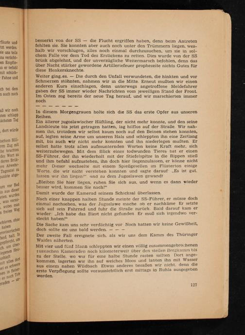 Ein älterer jugoslawischer Häftling, der nicht mehr konnte, und den seine Landsleute bis jetzt getragen hatten, lag hilflos auf der Straße. Wir nahmen ihn, trotzdem wir selbst kaum noch auf den Beinen stehen konnten, auf, legten seine Arme um unseren Hals und schleppten ihn eine Zeitlang mit, bis auch wir nicht mehr konnten und ihn niederlegen mußten. Er selbst hatte trotz allen aufmunternden Worten keine Kraft mehr, sich weiterzubewegen. Mit dem Blick eines todwunden Tieres bat er einen SS- Führer, der ihn wiederholt mit der Stiefelspitze in die Rippen stieß und ihm befahl aufzustehen, ihn doch hier liegenzulassen, er könne nicht mehr Dieser wechselte mit einem Spießgesellen im Flüsterton einige Worte, die wir nicht verstehen konnten und sagte darauf„ Es ist gut, lassen wir ihn liegen!". und zu dem Jugoslawen gewandt